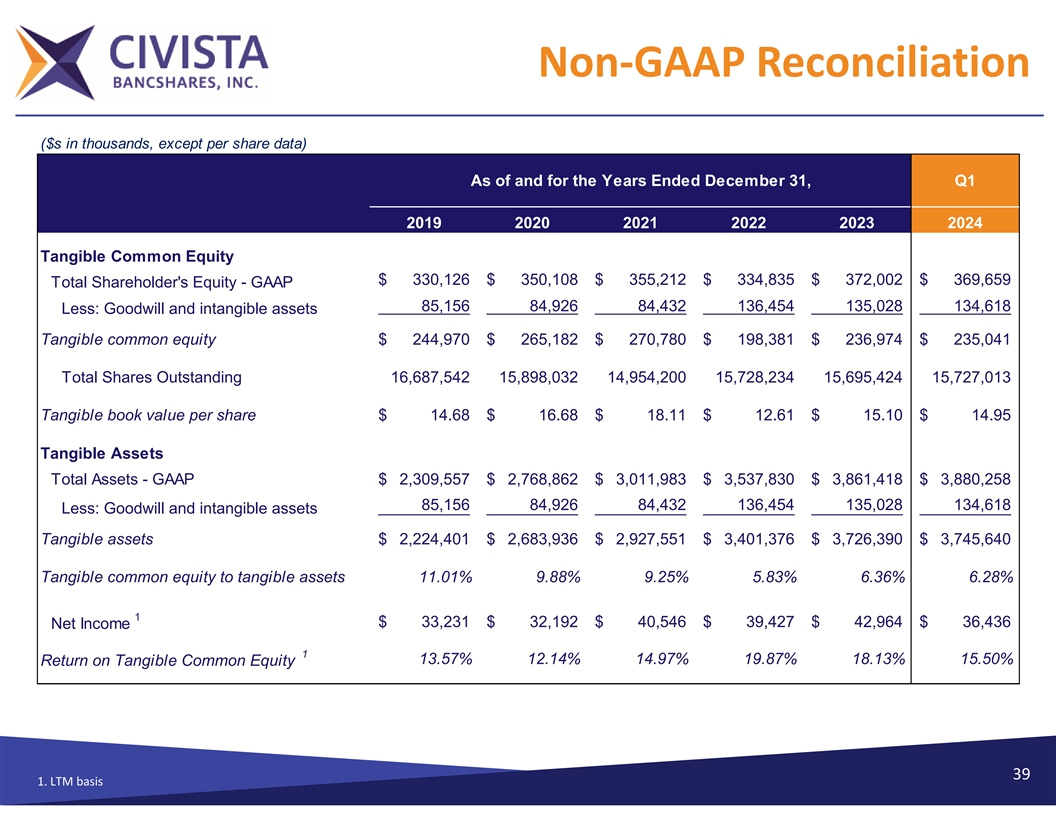 Operating Results ($s in thousands, except per share data) Q1 LTM 2019 2020 2021 2022 2023 2024 Net Interest Income $85,100 $89,727 $95,425 $110,204 $125,496 $121,267 Provision for Loan Losses 1,035 10,112 830 1,752 4,435 5,808 Noninterest Income 22,443 28,182 31,452 29,077 37,163 34,601 Noninterest Expense 66,947 70,665 78,484 90,493 107,611 107,667 Net Income/(Loss) 33,878 32,192 40,546 39,427 42,964 36,436 Net Income Available to Common Shareholders $33,231 $32,192 $40,546 $39,427 $42,964 $36,436 Diluted Earnings/(Loss) per Common Share $2.01 $2.00 $2.63 $2.60 $2.73 $2.33 Return on Average Assets (ROAA) 1.51% 1.17% 1.34% 1.22% 1.16% 0.99% Return on Average Equity (ROAE) 10.64% 9.57% 11.61% 12.46% 12.50% 10.36% 38