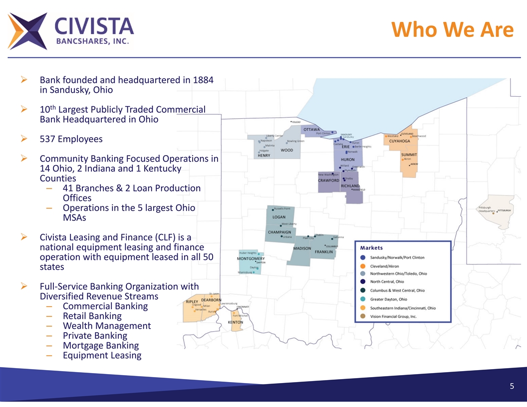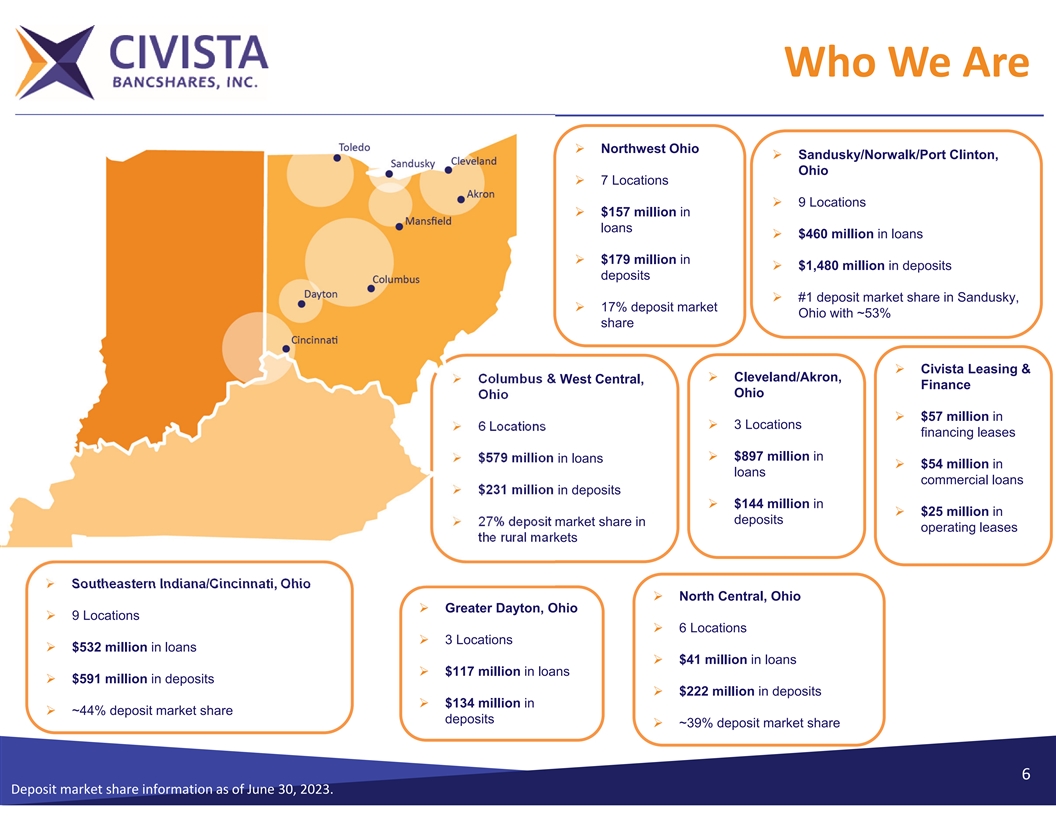 Who We Are Ø Bank founded and headquartered in 1884 in Sandusky, Ohio th Ø 10 Largest Publicly Traded Commercial Bank Headquartered in Ohio Ø 537 Employees Ø Community Banking Focused Operations in 14 Ohio, 2 Indiana and 1 Kentucky Counties – 41 Branches & 2 Loan Production Offices – Operations in the 5 largest Ohio MSAs Ø Civista Leasing and Finance (CLF) is a national equipment leasing and finance operation with equipment leased in all 50 states Ø Full‐Service Banking Organization with Diversified Revenue Streams – Commercial Banking – Retail Banking – Wealth Management – Private Banking – Mortgage Banking – Equipment Leasing 5