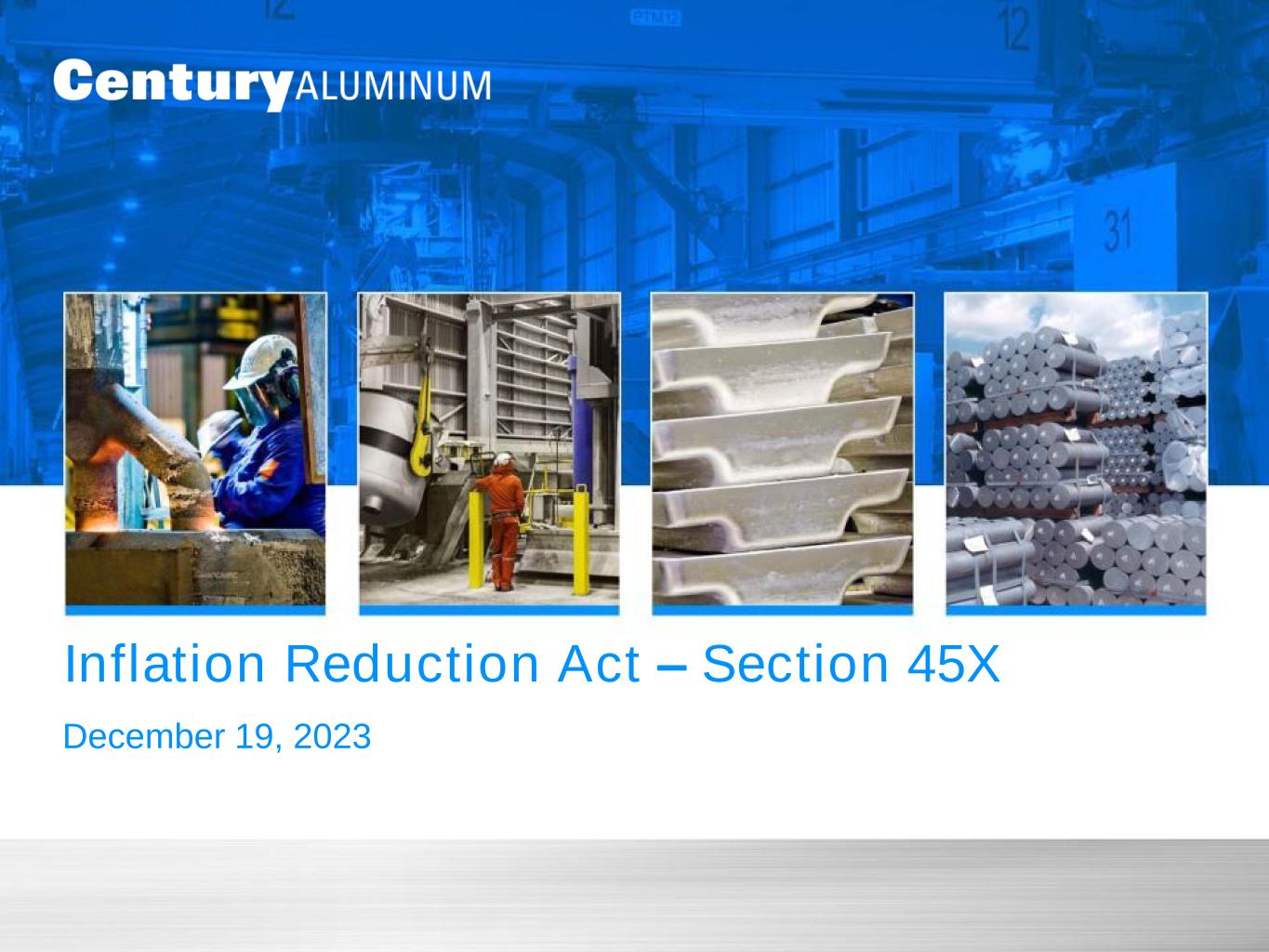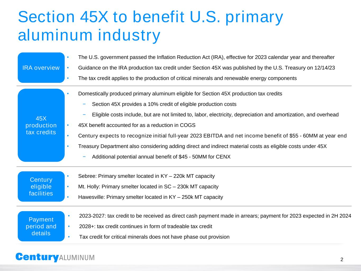 Section 45X to benefit U.S. primary aluminum industry • Sebree: Primary smelter located in KY – 220k MT capacity • Mt. Holly: Primary smelter located in SC – 230k MT capacity • Hawesville: Primary smelter located in KY – 250k MT capacity IRA overview Century eligible facilities • The U.S. government passed the Inflation Reduction Act (IRA), effective for 2023 calendar year and thereafter • Guidance on the IRA production tax credit under Section 45X was published by the U.S. Treasury on 12/14/23 • The tax credit applies to the production of critical minerals and renewable energy components • 2023-2027: tax credit to be received as direct cash payment made in arrears; payment for 2023 expected in 2H 2024 • 2028+: tax credit continues in form of tradeable tax credit • Tax credit for critical minerals does not have phase out provision Payment period and details 45X production tax credits • Domestically produced primary aluminum eligible for Section 45X production tax credits − Section 45X provides a 10% credit of eligible production costs − Eligible costs include, but are not limited to, labor, electricity, depreciation and amortization, and overhead • 45X benefit accounted for as a reduction in COGS • Century expects to recognize initial full-year 2023 EBITDA and net income benefit of $55 - 60MM at year end • Treasury Department also considering adding direct and indirect material costs as eligible costs under 45X − Additional potential annual benefit of $45 - 50MM for CENX 2