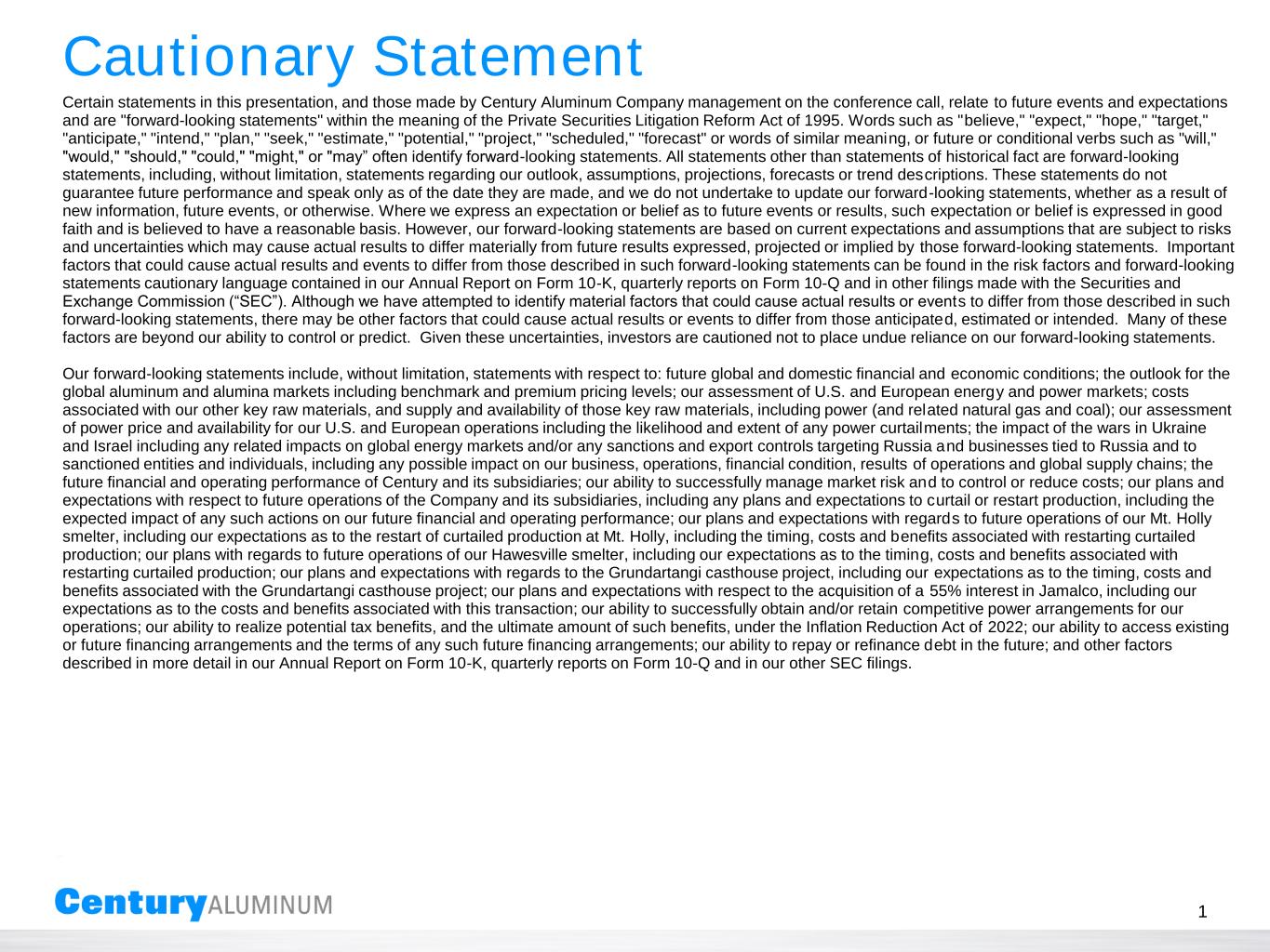 1 Certain statements in this presentation, and those made by Century Aluminum Company management on the conference call, relate to future events and expectations and are "forward-looking statements" within the meaning of the Private Securities Litigation Reform Act of 1995. Words such as "believe," "expect," "hope," "target," "anticipate," "intend," "plan," "seek," "estimate," "potential," "project," "scheduled," "forecast" or words of similar meaning, or future or conditional verbs such as "will," "would," "should," "could," "might," or "may” often identify forward-looking statements. All statements other than statements of historical fact are forward-looking statements, including, without limitation, statements regarding our outlook, assumptions, projections, forecasts or trend descriptions. These statements do not guarantee future performance and speak only as of the date they are made, and we do not undertake to update our forward-looking statements, whether as a result of new information, future events, or otherwise. Where we express an expectation or belief as to future events or results, such expectation or belief is expressed in good faith and is believed to have a reasonable basis. However, our forward-looking statements are based on current expectations and assumptions that are subject to risks and uncertainties which may cause actual results to differ materially from future results expressed, projected or implied by those forward-looking statements. Important factors that could cause actual results and events to differ from those described in such forward-looking statements can be found in the risk factors and forward-looking statements cautionary language contained in our Annual Report on Form 10-K, quarterly reports on Form 10-Q and in other filings made with the Securities and Exchange Commission (“SEC”). Although we have attempted to identify material factors that could cause actual results or events to differ from those described in such forward-looking statements, there may be other factors that could cause actual results or events to differ from those anticipated, estimated or intended. Many of these factors are beyond our ability to control or predict. Given these uncertainties, investors are cautioned not to place undue reliance on our forward-looking statements. Our forward-looking statements include, without limitation, statements with respect to: future global and domestic financial and economic conditions; the outlook for the global aluminum and alumina markets including benchmark and premium pricing levels; our assessment of U.S. and European energy and power markets; costs associated with our other key raw materials, and supply and availability of those key raw materials, including power (and related natural gas and coal); our assessment of power price and availability for our U.S. and European operations including the likelihood and extent of any power curtailments; the impact of the wars in Ukraine and Israel including any related impacts on global energy markets and/or any sanctions and export controls targeting Russia and businesses tied to Russia and to sanctioned entities and individuals, including any possible impact on our business, operations, financial condition, results of operations and global supply chains; the future financial and operating performance of Century and its subsidiaries; our ability to successfully manage market risk and to control or reduce costs; our plans and expectations with respect to future operations of the Company and its subsidiaries, including any plans and expectations to curtail or restart production, including the expected impact of any such actions on our future financial and operating performance; our plans and expectations with regards to future operations of our Mt. Holly smelter, including our expectations as to the restart of curtailed production at Mt. Holly, including the timing, costs and benefits associated with restarting curtailed production; our plans with regards to future operations of our Hawesville smelter, including our expectations as to the timing, costs and benefits associated with restarting curtailed production; our plans and expectations with regards to the Grundartangi casthouse project, including our expectations as to the timing, costs and benefits associated with the Grundartangi casthouse project; our plans and expectations with respect to the acquisition of a 55% interest in Jamalco, including our expectations as to the costs and benefits associated with this transaction; our ability to successfully obtain and/or retain competitive power arrangements for our operations; our ability to realize potential tax benefits, and the ultimate amount of such benefits, under the Inflation Reduction Act of 2022; our ability to access existing or future financing arrangements and the terms of any such future financing arrangements; our ability to repay or refinance debt in the future; and other factors described in more detail in our Annual Report on Form 10-K, quarterly reports on Form 10-Q and in our other SEC filings. Cautionary Statement