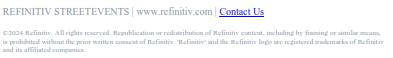 THE INFORMATION CONTAINED IN EVENT BRIEFS REFLECTS REFINITIV'S SUBJECTIVE CONDENSED PARAPHRASE OF THE APPLICABLE COMPANY'S CONFERENCE CALL AND THERE MAY BE MATERIAL ERRORS, OMISSIONS, OR INACCURACIES IN THE REPORTING OF THE SUBSTANCE OF THE CONFERENCE CALLS. IN NO WAY DOES REFINITIV OR THE APPLICABLE COMPANY ASSUME ANY RESPONSIBILITY FOR ANY INVESTMENT OR OTHER DECISIONS MADE BASED UPON THE INFORMATION PROVIDED ON THIS WEB SITE OR IN ANY EVENT BRIEF. USERS ARE ADVISED TO REVIEW THE APPLICABLE COMPANY'S CONFERENCE CALL ITSELF AND THE APPLICABLE COMPANY'S SEC FILINGS BEFORE MAKING ANY INVESTMENT OR OTHER DECISIONS.