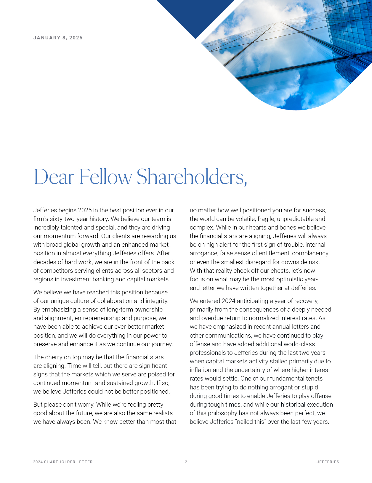 Jefferies begins 2025 in the best position ever in our firm’s sixty-two-year history. We believe our team is incredibly talented and special, and they are driving our momentum forward. Our clients are rewarding us with broad global growth and an enhanced market position in almost everything Jefferies offers. After decades of hard work, we are in the front of the pack of competitors serving clients across all sectors and regions in investment banking and capital markets.  We believe we have reached this position because of our unique culture of collaboration and integrity. By emphasizing a sense of long-term ownership and alignment, entrepreneurship and purpose, we have been able to achieve our ever-better market position, and we will do everything in our power to preserve and enhance it as we continue our journey.  The cherry on top may be that the financial stars are aligning. Time will tell, but there are significant  signs that the markets which we serve are poised for continued momentum and sustained growth. If so, we believe Jefferies could not be better positioned.  But please don’t worry. While we’re feeling pretty good about the future, we are also the same realists we have always been. We know better than most that  2024 S H A R EHO L D ER L E T T ER   2  J EF F ER I E S  no matter how well positioned you are for success, the world can be volatile, fragile, unpredictable and complex. While in our hearts and bones we believe the financial stars are aligning, Jefferies will always be on high alert for the first sign of trouble, internal arrogance, false sense of entitlement, complacency or even the smallest disregard for downside risk.  With that reality check off our chests, let’s now focus on what may be the most optimistic year- end letter we have written together at Jefferies.  We entered 2024 anticipating a year of recovery, primarily from the consequences of a deeply needed and overdue return to normalized interest rates. As we have emphasized in recent annual letters and other communications, we have continued to play offense and have added additional world-class professionals to Jefferies during the last two years when capital markets activity stalled primarily due to inflation and the uncertainty of where higher interest rates would settle. One of our fundamental tenets has been trying to do nothing arrogant or stupid during good times to enable Jefferies to play offense during tough times, and while our historical execution of this philosophy has not always been perfect, we believe Jefferies “nailed this” over the last few years.  Dear Fellow Shareholders,  J A N U A R Y 8 , 2025