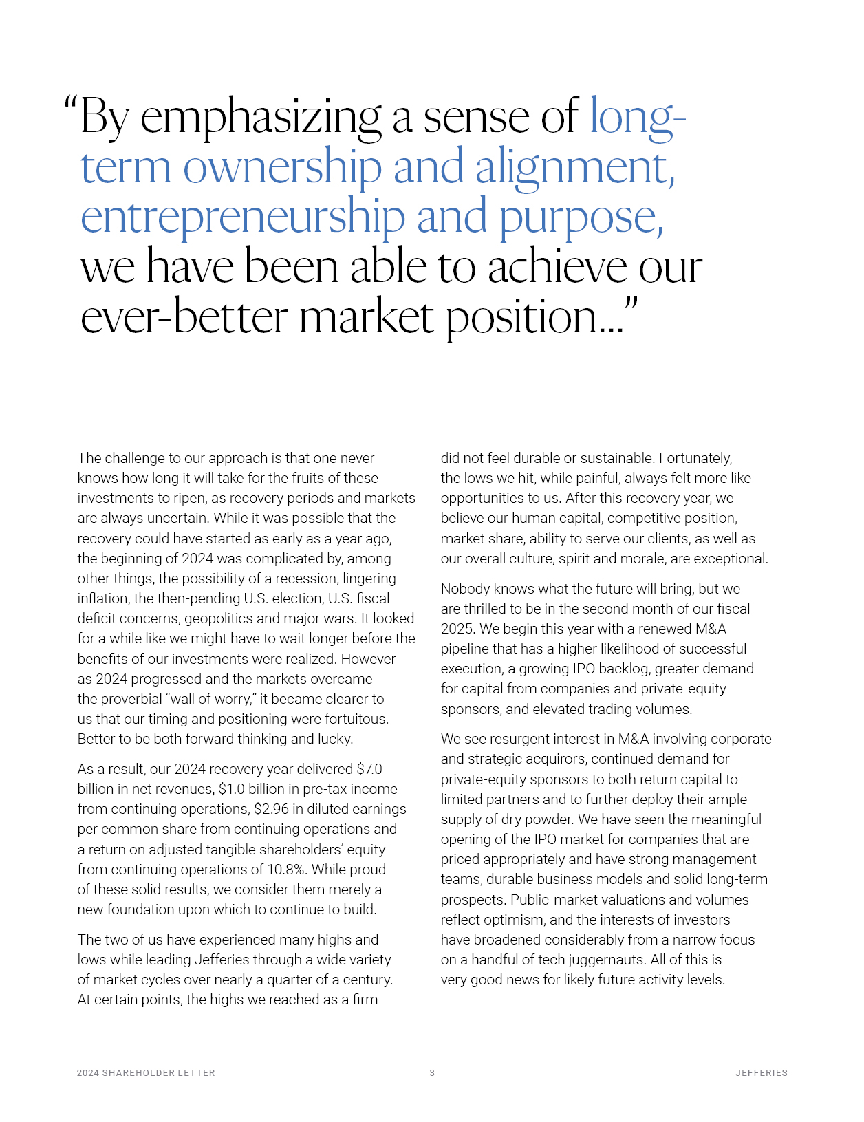 2024 S H A R EHO L D ER L E T T ER   2  J EF F ER I E S  did not feel durable or sustainable. Fortunately, the lows we hit, while painful, always felt more like opportunities to us. After this recovery year, we believe our human capital, competitive position,  market share, ability to serve our clients, as well as our overall culture, spirit and morale, are exceptional.  Nobody knows what the future will bring, but we are thrilled to be in the second month of our fiscal 2025. We begin this year with a renewed M&A pipeline that has a higher likelihood of successful execution, a growing IPO backlog, greater demand for capital from companies and private-equity sponsors, and elevated trading volumes.  We see resurgent interest in M&A involving corporate and strategic acquirors, continued demand for private-equity sponsors to both return capital to limited partners and to further deploy their ample supply of dry powder. We have seen the meaningful opening of the IPO market for companies that are priced appropriately and have strong management teams, durable business models and solid long-term prospects. Public-market valuations and volumes reflect optimism, and the interests of investors  have broadened considerably from a narrow focus on a handful of tech juggernauts. All of this is  very good news for likely future activity levels.  The challenge to our approach is that one never knows how long it will take for the fruits of these investments to ripen, as recovery periods and markets are always uncertain. While it was possible that the recovery could have started as early as a year ago,  the beginning of 2024 was complicated by, among other things, the possibility of a recession, lingering inflation, the then-pending U.S. election, U.S. fiscal deficit concerns, geopolitics and major wars. It looked for a while like we might have to wait longer before the benefits of our investments were realized. However  as 2024 progressed and the markets overcame the proverbial “wall of worry,” it became clearer to us that our timing and positioning were fortuitous. Better to be both forward thinking and lucky.  As a result, our 2024 recovery year delivered $7.0 billion in net revenues, $1.0 billion in pre-tax income from continuing operations, $2.96 in diluted earnings per common share from continuing operations and a return on adjusted tangible shareholders’ equity from continuing operations of 10.8%. While proud  of these solid results, we consider them merely a new foundation upon which to continue to build.  The two of us have experienced many highs and lows while leading Jefferies through a wide variety of market cycles over nearly a quarter of a century. At certain points, the highs we reached as a firm  “By emphasizing a sense of long- term ownership and alignment, entrepreneurship and purpose, we have been able to achieve our ever-better market position...”
