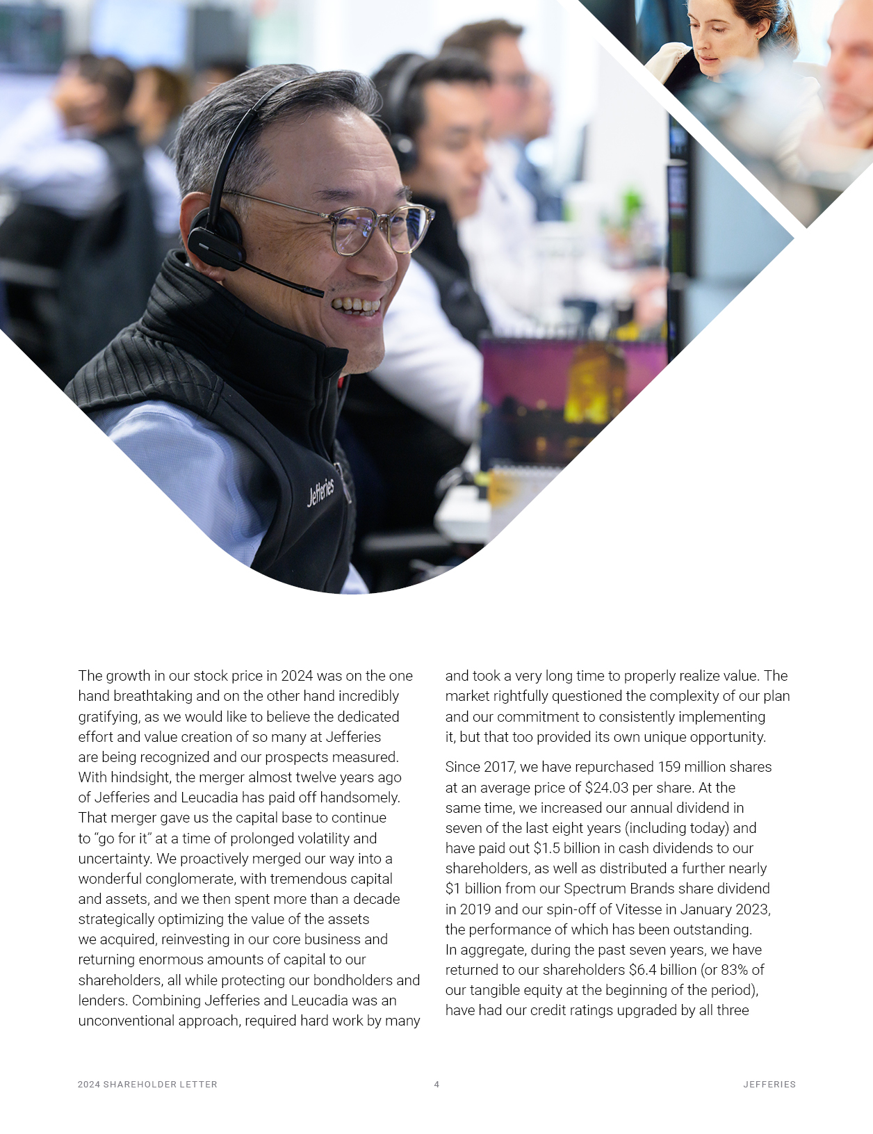 The growth in our stock price in 2024 was on the one hand breathtaking and on the other hand incredibly gratifying, as we would like to believe the dedicated effort and value creation of so many at Jefferies  are being recognized and our prospects measured. With hindsight, the merger almost twelve years ago of Jefferies and Leucadia has paid off handsomely. That merger gave us the capital base to continue to “go for it” at a time of prolonged volatility and uncertainty. We proactively merged our way into a wonderful conglomerate, with tremendous capital and assets, and we then spent more than a decade strategically optimizing the value of the assets  we acquired, reinvesting in our core business and returning enormous amounts of capital to our shareholders, all while protecting our bondholders and lenders. Combining Jefferies and Leucadia was an unconventional approach, required hard work by many  2024 S H A R EHO L D ER L E T T ER   2  J EF F ER I E S  and took a very long time to properly realize value. The market rightfully questioned the complexity of our plan and our commitment to consistently implementing  it, but that too provided its own unique opportunity.  Since 2017, we have repurchased 159 million shares at an average price of $24.03 per share. At the same time, we increased our annual dividend in seven of the last eight years (including today) and have paid out $1.5 billion in cash dividends to our shareholders, as well as distributed a further nearly  $1 billion from our Spectrum Brands share dividend in 2019 and our spin-off of Vitesse in January 2023, the performance of which has been outstanding.  In aggregate, during the past seven years, we have returned to our shareholders $6.4 billion (or 83% of our tangible equity at the beginning of the period), have had our credit ratings upgraded by all three