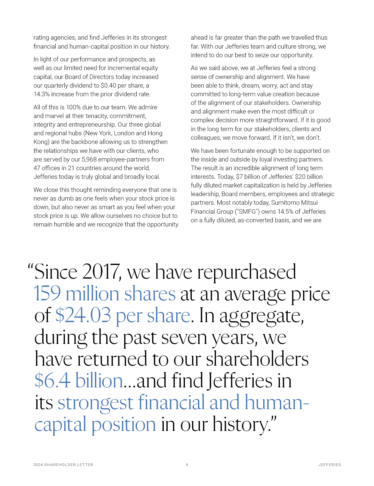 2024 S H A R EHO L D ER L E T T ER   6  J EF F ER I E S  rating agencies, and find Jefferies in its strongest financial and human-capital position in our history.  In light of our performance and prospects, as well as our limited need for incremental equity capital, our Board of Directors today increased our quarterly dividend to $0.40 per share, a 14.3% increase from the prior dividend rate.  All of this is 100% due to our team. We admire and marvel at their tenacity, commitment, integrity and entrepreneurship. Our three global and regional hubs (New York, London and Hong Kong) are the backbone allowing us to strengthen the relationships we have with our clients, who are served by our 5,968 employee-partners from 47 offices in 21 countries around the world.  Jefferies today is truly global and broadly local.  We close this thought reminding everyone that one is never as dumb as one feels when your stock price is down, but also never as smart as you feel when your stock price is up. We allow ourselves no choice but to remain humble and we recognize that the opportunity  ahead is far greater than the path we travelled thus far. With our Jefferies team and culture strong, we intend to do our best to seize our opportunity.  As we said above, we at Jefferies feel a strong sense of ownership and alignment. We have been able to think, dream, worry, act and stay committed to long-term value creation because of the alignment of our stakeholders. Ownership and alignment make even the most difficult or  complex decision more straightforward. If it is good in the long term for our stakeholders, clients and colleagues, we move forward. If it isn’t, we don’t.  We have been fortunate enough to be supported on the inside and outside by loyal investing partners.  The result is an incredible alignment of long term interests. Today, $7 billion of Jefferies’ $20 billion fully diluted market capitalization is held by Jefferies leadership, Board members, employees and strategic partners. Most notably today, Sumitomo Mitsui Financial Group (“SMFG”) owns 14.5% of Jefferies  on a fully diluted, as-converted basis, and we are  “Since 2017, we have repurchased  159 million shares at an average price of $24.03 per share. In aggregate, during the past seven years, we  have returned to our shareholders  $6.4 billion…and find Jefferies in its strongest financial and human- capital position in our history.”