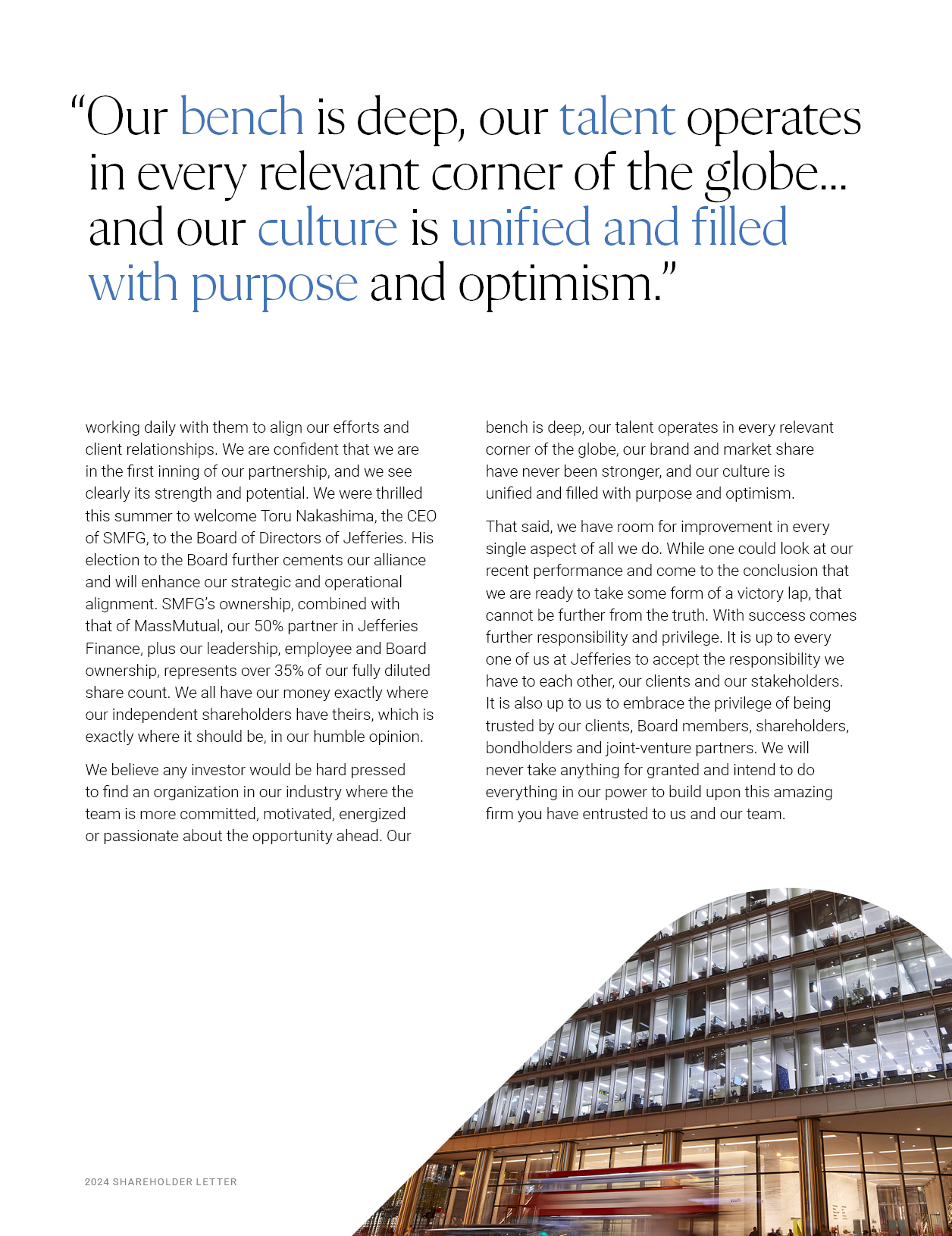 2024 S H A R EHO L D ER L E T T ER   7 J EF F ER I E S  working daily with them to align our efforts and client relationships. We are confident that we are in the first inning of our partnership, and we see clearly its strength and potential. We were thrilled  this summer to welcome Toru Nakashima, the CEO of SMFG, to the Board of Directors of Jefferies. His election to the Board further cements our alliance and will enhance our strategic and operational alignment. SMFG’s ownership, combined with  that of MassMutual, our 50% partner in Jefferies Finance, plus our leadership, employee and Board ownership, represents over 35% of our fully diluted share count. We all have our money exactly where our independent shareholders have theirs, which is exactly where it should be, in our humble opinion.  We believe any investor would be hard pressed to find an organization in our industry where the team is more committed, motivated, energized or passionate about the opportunity ahead. Our  bench is deep, our talent operates in every relevant corner of the globe, our brand and market share have never been stronger, and our culture is unified and filled with purpose and optimism.  That said, we have room for improvement in every single aspect of all we do. While one could look at our recent performance and come to the conclusion that we are ready to take some form of a victory lap, that cannot be further from the truth. With success comes further responsibility and privilege. It is up to every one of us at Jefferies to accept the responsibility we have to each other, our clients and our stakeholders.  It is also up to us to embrace the privilege of being trusted by our clients, Board members, shareholders, bondholders and joint-venture partners. We will never take anything for granted and intend to do everything in our power to build upon this amazing firm you have entrusted to us and our team.  “Our bench is deep, our talent operates in every relevant corner of the globe... and our culture is unified and filled with purpose and optimism.”