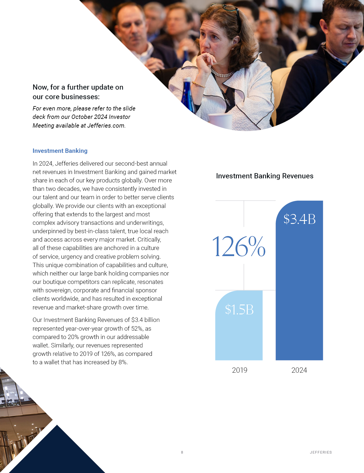 Now, for a further update on our core businesses:  For even more, please refer to the slide deck from our October 2024 Investor Meeting available at Jefferies.com.  Investment Banking  In 2024, Jefferies delivered our second-best annual net revenues in Investment Banking and gained market share in each of our key products globally. Over more than two decades, we have consistently invested in our talent and our team in order to better serve clients globally. We provide our clients with an exceptional offering that extends to the largest and most  complex advisory transactions and underwritings, underpinned by best-in-class talent, true local reach and access across every major market. Critically,  all of these capabilities are anchored in a culture of service, urgency and creative problem solving.  This unique combination of capabilities and culture, which neither our large bank holding companies nor our boutique competitors can replicate, resonates with sovereign, corporate and financial sponsor clients worldwide, and has resulted in exceptional revenue and market-share growth over time.  Our Investment Banking Revenues of $3.4 billion represented year-over-year growth of 52%, as compared to 20% growth in our addressable wallet. Similarly, our revenues represented growth relative to 2019 of 126%, as compared  to a wallet that has increased by 8%.  $3.4B  $1.5B  2024 S H A R EHO L D ER L E T T ER   10  J EF F ER I E S  2024  2019  Investment Banking Revenues  126%
