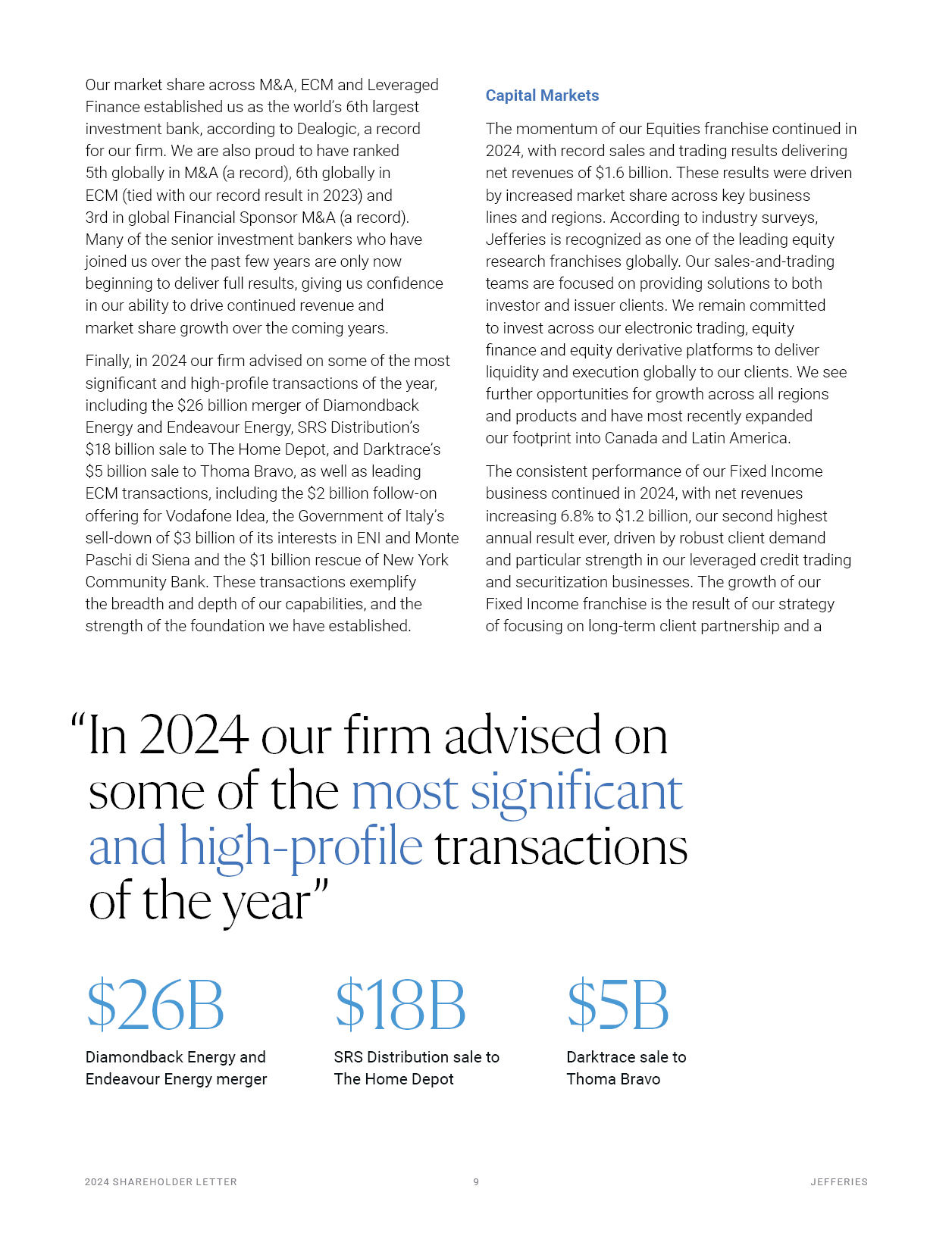 2024 S H A R EHO L D ER L E T T ER   10  J EF F ER I E S  Our market share across M&A, ECM and Leveraged Finance established us as the world’s 6th largest investment bank, according to Dealogic, a record for our firm. We are also proud to have ranked  5th globally in M&A (a record), 6th globally in ECM (tied with our record result in 2023) and 3rd in global Financial Sponsor M&A (a record).  Many of the senior investment bankers who have joined us over the past few years are only now beginning to deliver full results, giving us confidence in our ability to drive continued revenue and  market share growth over the coming years.  Finally, in 2024 our firm advised on some of the most significant and high-profile transactions of the year, including the $26 billion merger of Diamondback Energy and Endeavour Energy, SRS Distribution’s  $18 billion sale to The Home Depot, and Darktrace’s  $5 billion sale to Thoma Bravo, as well as leading ECM transactions, including the $2 billion follow-on offering for Vodafone Idea, the Government of Italy’s  sell-down of $3 billion of its interests in ENI and Monte Paschi di Siena and the $1 billion rescue of New York Community Bank. These transactions exemplify  the breadth and depth of our capabilities, and the strength of the foundation we have established.  Capital Markets  The momentum of our Equities franchise continued in 2024, with record sales and trading results delivering net revenues of $1.6 billion. These results were driven by increased market share across key business  lines and regions. According to industry surveys, Jefferies is recognized as one of the leading equity research franchises globally. Our sales-and-trading teams are focused on providing solutions to both investor and issuer clients. We remain committed to invest across our electronic trading, equity finance and equity derivative platforms to deliver  liquidity and execution globally to our clients. We see further opportunities for growth across all regions and products and have most recently expanded  our footprint into Canada and Latin America.  The consistent performance of our Fixed Income business continued in 2024, with net revenues increasing 6.8% to $1.2 billion, our second highest annual result ever, driven by robust client demand and particular strength in our leveraged credit trading and securitization businesses. The growth of our Fixed Income franchise is the result of our strategy of focusing on long-term client partnership and a  “In 2024 our firm advised on some of the most significant and high-profile transactions of the year”  $26B  Diamondback Energy and Endeavour Energy merger  $18B  SRS Distribution sale to The Home Depot  $5B  Darktrace sale to Thoma Bravo