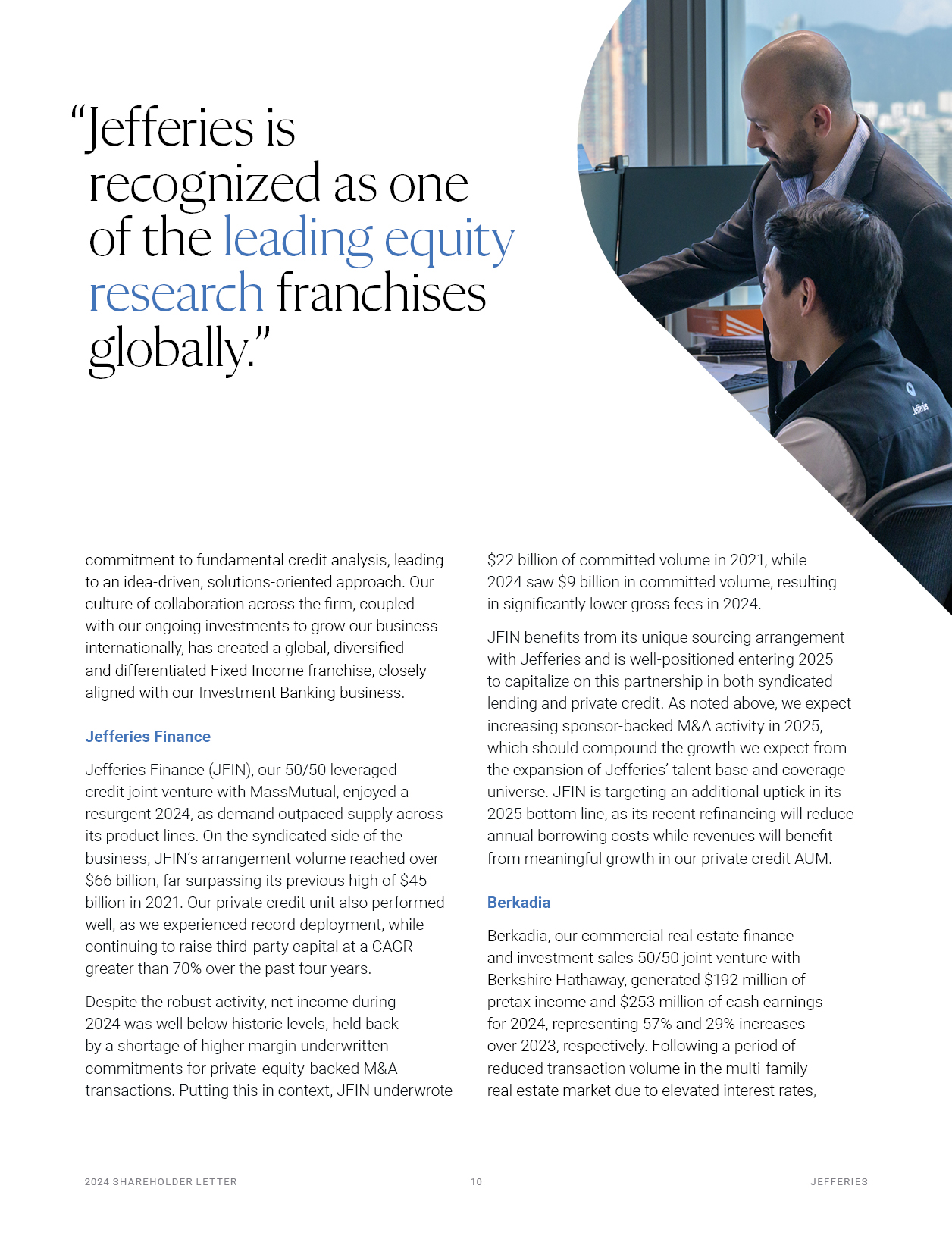 commitment to fundamental credit analysis, leading to an idea-driven, solutions-oriented approach. Our culture of collaboration across the firm, coupled with our ongoing investments to grow our business internationally, has created a global, diversified  and differentiated Fixed Income franchise, closely aligned with our Investment Banking business.  Jefferies Finance  Jefferies Finance (JFIN), our 50/50 leveraged credit joint venture with MassMutual, enjoyed a  resurgent 2024, as demand outpaced supply across its product lines. On the syndicated side of the business, JFIN’s arrangement volume reached over  $66 billion, far surpassing its previous high of $45 billion in 2021. Our private credit unit also performed well, as we experienced record deployment, while continuing to raise third-party capital at a CAGR greater than 70% over the past four years.  Despite the robust activity, net income during 2024 was well below historic levels, held back by a shortage of higher margin underwritten commitments for private-equity-backed M&A  transactions. Putting this in context, JFIN underwrote  $22 billion of committed volume in 2021, while 2024 saw $9 billion in committed volume, resulting in significantly lower gross fees in 2024.  JFIN benefits from its unique sourcing arrangement with Jefferies and is well-positioned entering 2025 to capitalize on this partnership in both syndicated  lending and private credit. As noted above, we expect increasing sponsor-backed M&A activity in 2025, which should compound the growth we expect from the expansion of Jefferies’ talent base and coverage universe. JFIN is targeting an additional uptick in its 2025 bottom line, as its recent refinancing will reduce annual borrowing costs while revenues will benefit from meaningful growth in our private credit AUM.  Berkadia  Berkadia, our commercial real estate finance and investment sales 50/50 joint venture with Berkshire Hathaway, generated $192 million of pretax income and $253 million of cash earnings for 2024, representing 57% and 29% increases over 2023, respectively. Following a period of reduced transaction volume in the multi-family real estate market due to elevated interest rates,  “Jefferies is recognized as one of the leading equity research franchises globally.”  2024 S H A R EHO L D ER L E T T ER   10  J EF F ER I E S