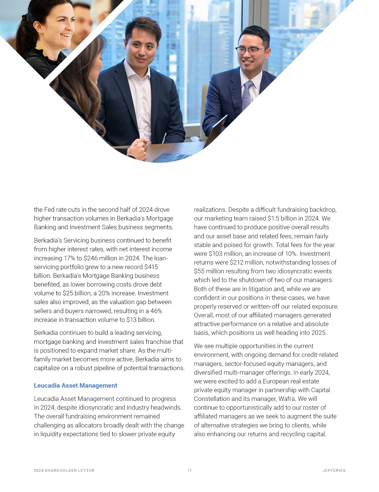 the Fed rate cuts in the second half of 2024 drove higher transaction volumes in Berkadia’s Mortgage Banking and Investment Sales business segments.  Berkadia’s Servicing business continued to benefit from higher interest rates, with net interest income increasing 17% to $246 million in 2024. The loan- servicing portfolio grew to a new record $415 billion. Berkadia’s Mortgage Banking business benefited, as lower borrowing costs drove debt volume to $25 billion, a 20% increase. Investment sales also improved, as the valuation gap between sellers and buyers narrowed, resulting in a 46% increase in transaction volume to $13 billion.  Berkadia continues to build a leading servicing, mortgage banking and investment sales franchise that is positioned to expand market share. As the multi- family market becomes more active, Berkadia aims to capitalize on a robust pipeline of potential transactions.  Leucadia Asset Management  Leucadia Asset Management continued to progress in 2024, despite idiosyncratic and industry headwinds.  The overall fundraising environment remained challenging as allocators broadly dealt with the change in liquidity expectations tied to slower private equity  realizations. Despite a difficult fundraising backdrop, our marketing team raised $1.5 billion in 2024. We have continued to produce positive overall results and our asset base and related fees, remain fairly stable and poised for growth. Total fees for the year were $103 million, an increase of 10%. Investment returns were $212 million, notwithstanding losses of  $55 million resulting from two idiosyncratic events which led to the shutdown of two of our managers. Both of these are in litigation and, while we are confident in our positions in these cases, we have properly reserved or written-off our related exposure. Overall, most of our affiliated managers generated attractive performance on a relative and absolute basis, which positions us well heading into 2025.  We see multiple opportunities in the current environment, with ongoing demand for credit-related managers, sector-focused equity managers, and diversified multi-manager offerings. In early 2024, we were excited to add a European real estate private equity manager in partnership with Capital Constellation and its manager, Wafra. We will continue to opportunistically add to our roster of affiliated managers as we seek to augment the suite of alternative strategies we bring to clients, while also enhancing our returns and recycling capital.  2024 S H A R EHO L D ER L E T T ER   10  J EF F ER I E S