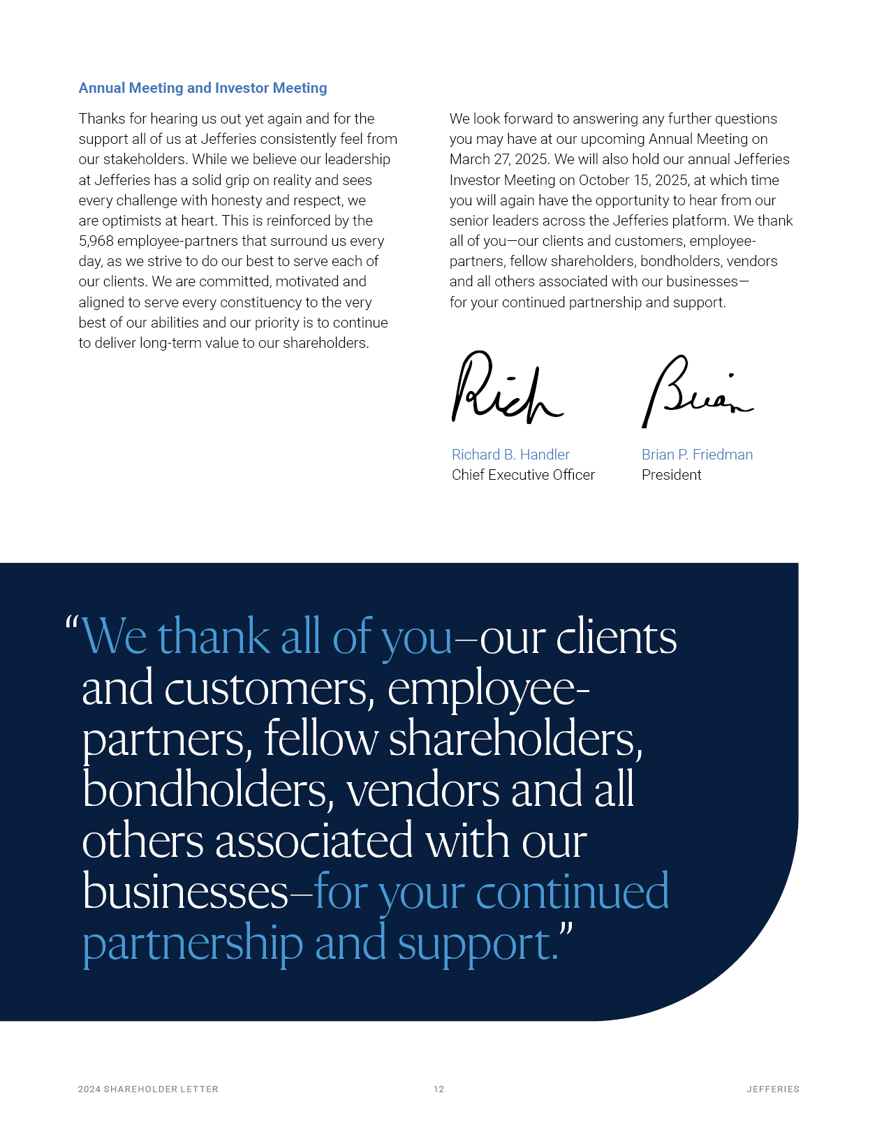 Annual Meeting and Investor Meeting  Thanks for hearing us out yet again and for the support all of us at Jefferies consistently feel from our stakeholders. While we believe our leadership at Jefferies has a solid grip on reality and sees every challenge with honesty and respect, we  are optimists at heart. This is reinforced by the 5,968 employee-partners that surround us every day, as we strive to do our best to serve each of our clients. We are committed, motivated and aligned to serve every constituency to the very best of our abilities and our priority is to continue to deliver long-term value to our shareholders.  We look forward to answering any further questions you may have at our upcoming Annual Meeting on March 27, 2025. We will also hold our annual Jefferies Investor Meeting on October 15, 2025, at which time you will again have the opportunity to hear from our senior leaders across the Jefferies platform. We thank all of you—our clients and customers, employee- partners, fellow shareholders, bondholders, vendors and all others associated with our businesses—  for your continued partnership and support.  Richard B. Handler Chief Executive Officer  2024 S H A R EHO L D ER L E T T ER   10  J EF F ER I E S  Brian P. Friedman President  “We thank all of you–our clients and customers, employee- partners, fellow shareholders, bondholders, vendors and all others associated with our businesses–for your continued partnership and support.”