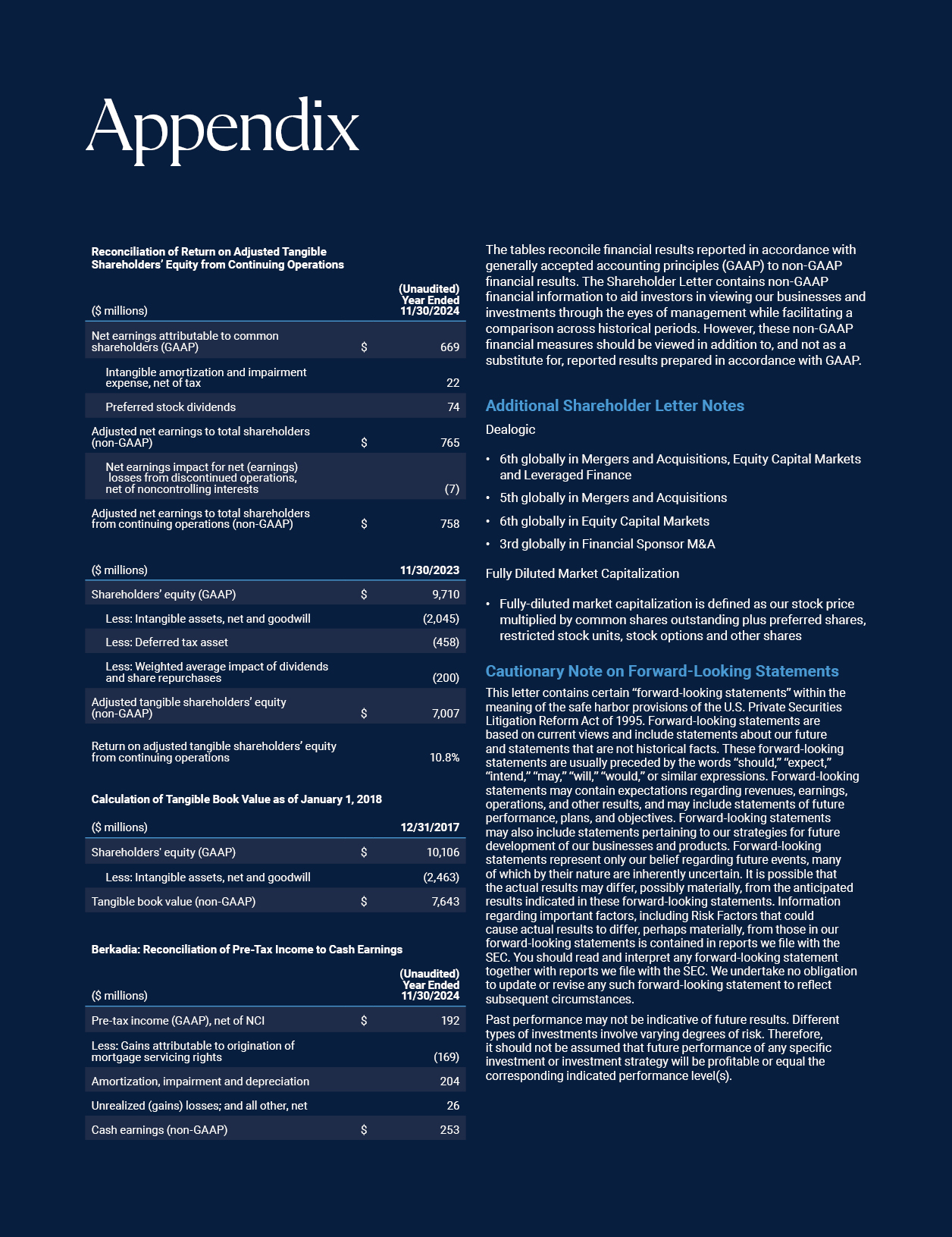 The tables reconcile financial results reported in accordance with generally accepted accounting principles (GAAP) to non-GAAP financial results. The Shareholder Letter contains non-GAAP financial information to aid investors in viewing our businesses and investments through the eyes of management while facilitating a comparison across historical periods. However, these non-GAAP financial measures should be viewed in addition to, and not as a substitute for, reported results prepared in accordance with GAAP.  Additional Shareholder Letter Notes  Dealogic  6th globally in Mergers and Acquisitions, Equity Capital Markets and Leveraged Finance  5th globally in Mergers and Acquisitions  6th globally in Equity Capital Markets  3rd globally in Financial Sponsor M&A  Fully Diluted Market Capitalization  Fully-diluted market capitalization is defined as our stock price multiplied by common shares outstanding plus preferred shares, restricted stock units, stock options and other shares  Cautionary Note on Forward-Looking Statements  This letter contains certain “forward-looking statements” within the meaning of the safe harbor provisions of the U.S. Private Securities Litigation Reform Act of 1995. Forward-looking statements are based on current views and include statements about our future and statements that are not historical facts. These forward-looking statements are usually preceded by the words “should,” “expect,”  “intend,” “may,” “will,” “would,” or similar expressions. Forward-looking  statements may contain expectations regarding revenues, earnings, operations, and other results, and may include statements of future performance, plans, and objectives. Forward-looking statements may also include statements pertaining to our strategies for future development of our businesses and products. Forward-looking statements represent only our belief regarding future events, many of which by their nature are inherently uncertain. It is possible that the actual results may differ, possibly materially, from the anticipated results indicated in these forward-looking statements. Information regarding important factors, including Risk Factors that could  cause actual results to differ, perhaps materially, from those in our  forward-looking statements is contained in reports we file with the SEC. You should read and interpret any forward-looking statement together with reports we file with the SEC. We undertake no obligation to update or revise any such forward-looking statement to reflect subsequent circumstances.  Past performance may not be indicative of future results. Different types of investments involve varying degrees of risk. Therefore,  it should not be assumed that future performance of any specific investment or investment strategy will be profitable or equal the corresponding indicated performance level(s).  Berkadia: Reconciliation of Pre-Tax Income to Cash Earnings  (Unaudited)  Year Ended  ($ millions) 11/30/2024  Pre-tax income (GAAP), net of NCI $ 192  Less: Gains attributable to origination of  mortgage servicing rights (169)  Amortization, impairment and depreciation 204  Unrealized (gains) losses; and all other, net 26  ($ millions) 12/31/2017  Shareholders' equity (GAAP) $ 10,106  Less: Intangible assets, net and goodwill (2,463)  Tangible book value (non-GAAP) $ 7,643  Less: Deferred tax asset (458)  $  7,007  Less: Weighted average impact of dividends  and share repurchases (200)  Adjusted tangible shareholders’ equity (non-GAAP)  Return on adjusted tangible shareholders’ equity from continuing operations  Calculation of Tangible Book Value as of January 1, 2018  10.8%  (Unaudited) Year Ended 11/30/2024  Cash earnings (non-GAAP)  $  253  $  669  Reconciliation of Return on Adjusted Tangible Shareholders’ Equity from Continuing Operations  ($ millions)  Net earnings attributable to common shareholders (GAAP)  Intangible amortization and impairment  expense, net of tax 22  Preferred stock dividends 74  (7)  Adjusted net earnings to total shareholders  (non-GAAP) $ 765  Net earnings impact for net (earnings) losses from discontinued operations, net of noncontrolling interests  Adjusted net earnings to total shareholders from continuing operations (non-GAAP)  ($ millions) 11/30/2023  Shareholders’ equity (GAAP) $ 9,710 Less: Intangible assets, net and goodwill (2,045)  $  758  Appendix