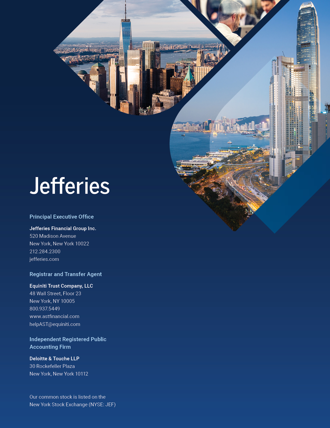 2024 S H A R EHO L D ER L E T T ER 14 J EF F ER I E S  Principal Executive Office  Jefferies Financial Group Inc.  520 Madison Avenue  New York, New York 10022 212.284.2300  jefferies.com  Registrar and Transfer Agent  Equiniti Trust Company, LLC  48 Wall Street, Floor 23 New York, NY 10005 800.937.5449  www.astfinancial.com helpAST@equiniti.com  Independent Registered Public Accounting Firm  Deloitte & Touche LLP  30 Rockefeller Plaza  New York, New York 10112  Our common stock is listed on the  New York Stock Exchange (NYSE: JEF)