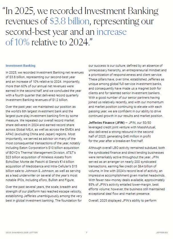 20 25 SH A R EHO L D ER L E T T ER   2  JEFFER I E S  Investment Banking  In 2025, we recorded Investment Banking net revenues  of $3.8 billion, representing our second-best year and an increase of 10% relative to 2024. Importantly, more than 60% of our annual net revenues were earned in the second half, and we concluded the year with a fourth quarter that delivered record quarterly Investment Banking revenues of $1.2 billion.  Over the past year, we maintained our position as the world’s 6th largest investment bank and the largest pure-play investment banking firm by some measure. We repeated our overall record market share delivered in 2024 and earned record share across Global M&A, as well as across the EMEA and APAC (excluding China and Japan) regions. Most importantly, we served as advisor on many of the most consequential transactions of the year, notably including Eaton Corporation’s $10 billion acquisition of BOYD’s Thermal Management Division, AT&T’s  $23 billion acquisition of Wireless Assets from EchoStar, Monte dei Paschi di Siena’s €14 billion acquisition of Mediobanca and Intra-Cellular’s $15 billion sale to Johnson & Johnson, as well as serving as a lead underwriter on several of the year’s most notable IPOs, including eToro, Bullish and Figure.  Over the past several years, the scale, breadth and strength of our platform has reached escape velocity, establishing Jefferies unambiguously among the very best in global investment banking. The foundation for  our success is our culture, defined by an absence of unnecessary hierarchy, an entrepreneurial mindset and a prioritization of responsiveness and client service.  These pillars have, over time, established Jefferies as unique among global full-service investment banks, and consequently have made us a magnet both for clients and for talented senior investment bankers.  With a good number of our senior partners having joined us relatively recently, and with our momentum and market position continuing to elevate with each passing year, we are confident in our ability to drive continued growth in our results and market position.  Jefferies Finance (JFIN) — JFIN, our 50/50 leveraged credit joint venture with MassMutual, also delivered a strong rebound in the second half of 2025, generating $48 million in profit  for the year after a breakeven first half.  Although overall LBO activity remained subdued, both the syndicated finance and direct lending businesses were remarkably active throughout the year. JFIN served as an arranger on nearly 200 syndicated transactions, earning fee credit on $64 billion of volume, in line with 2024’s record level of activity, an impressive accomplishment given market headwinds. With fewer new-money deals available, approximately 85% of JFIN’s activity entailed lower-margin, best efforts volume; however, the business still maintained exceptional deal flow and market presence.  Overall, 2025 displayed JFIN’s ability to perform  “In 2025, we recorded Investment Banking revenues of $3.8 billion, representing our second-best year and an increase  of 10% relative to 2024.”