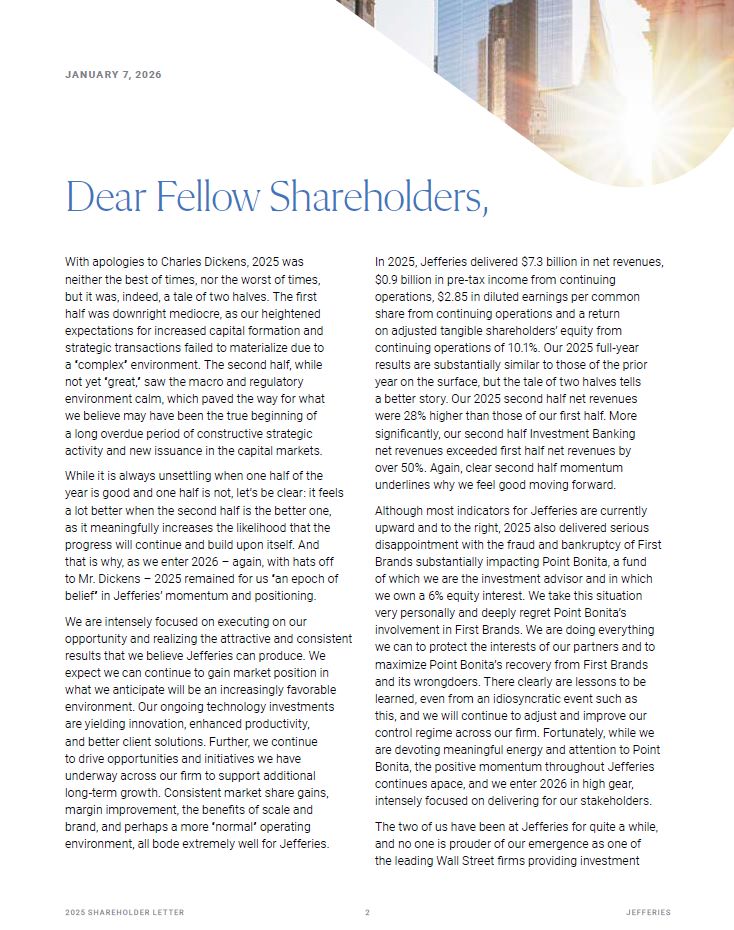 With apologies to Charles Dickens, 2025 was neither the best of times, nor the worst of times, but it was, indeed, a tale of two halves. The first half was downright mediocre, as our heightened expectations for increased capital formation and strategic transactions failed to materialize due to a “complex” environment. The second half, while not yet “great,” saw the macro and regulatory environment calm, which paved the way for what we believe may have been the true beginning of a long overdue period of constructive strategic activity and new issuance in the capital markets.  While it is always unsettling when one half of the year is good and one half is not, let’s be clear: it feels a lot better when the second half is the better one, as it meaningfully increases the likelihood that the progress will continue and build upon itself. And  that is why, as we enter 2026 – again, with hats off to Mr. Dickens – 2025 remained for us “an epoch of belief” in Jefferies’ momentum and positioning.  We are intensely focused on executing on our opportunity and realizing the attractive and consistent results that we believe Jefferies can produce. We expect we can continue to gain market position in what we anticipate will be an increasingly favorable environment. Our ongoing technology investments are yielding innovation, enhanced productivity,  and better client solutions. Further, we continue to drive opportunities and initiatives we have underway across our firm to support additional long-term growth. Consistent market share gains, margin improvement, the benefits of scale and brand, and perhaps a more “normal” operating environment, all bode extremely well for Jefferies.  20 25 SH A R EHO L D ER L E T T ER   2  JEFFER I E S  In 2025, Jefferies delivered $7.3 billion in net revenues,  $0.9 billion in pre-tax income from continuing operations, $2.85 in diluted earnings per common share from continuing operations and a return  on adjusted tangible shareholders’ equity from continuing operations of 10.1%. Our 2025 full-year results are substantially similar to those of the prior year on the surface, but the tale of two halves tells a better story. Our 2025 second half net revenues were 28% higher than those of our first half. More significantly, our second half Investment Banking net revenues exceeded first half net revenues by over 50%. Again, clear second half momentum underlines why we feel good moving forward.  Although most indicators for Jefferies are currently upward and to the right, 2025 also delivered serious disappointment with the fraud and bankruptcy of First Brands substantially impacting Point Bonita, a fund  of which we are the investment advisor and in which we own a 6% equity interest. We take this situation very personally and deeply regret Point Bonita’s involvement in First Brands. We are doing everything we can to protect the interests of our partners and to maximize Point Bonita’s recovery from First Brands and its wrongdoers. There clearly are lessons to be learned, even from an idiosyncratic event such as this, and we will continue to adjust and improve our control regime across our firm. Fortunately, while we are devoting meaningful energy and attention to Point Bonita, the positive momentum throughout Jefferies continues apace, and we enter 2026 in high gear, intensely focused on delivering for our stakeholders.  The two of us have been at Jefferies for quite a while, and no one is prouder of our emergence as one of the leading Wall Street firms providing investment  Dear Fellow Shareholders,  J A N U A R Y 7, 2026