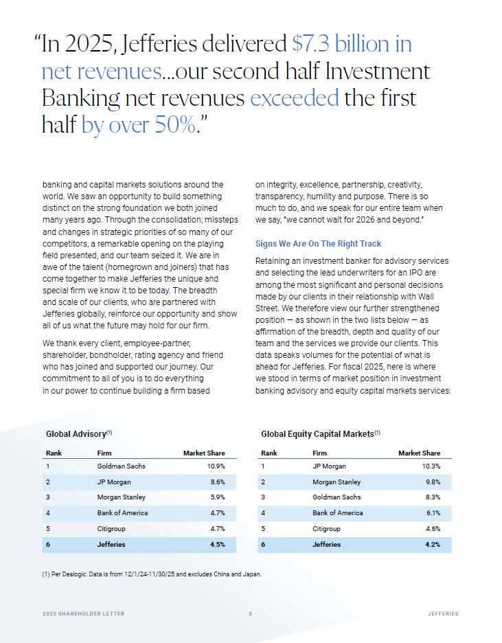 Global Advisory(1)  20 25 SH A R EHO L D ER L E T T ER   2  JEFFER I E S  Global Equity Capital Markets(1)  Rank  Firm  Market Share  Rank  Firm  Market Share  1  Goldman Sachs  10.9%  1  JP Morgan  10.3%  2  JP Morgan  8.6%  2  Morgan Stanley  9.8%  3  Morgan Stanley  5.9%  3  Goldman Sachs  8.3%  4  Bank of America  4.7%  4  Bank of America  6.1%  5  Citigroup  4.7%  5  Citigroup  4.6%  6  Jefferies  4.5%  6  Jefferies  4.2%  on integrity, excellence, partnership, creativity, transparency, humility and purpose. There is so much to do, and we speak for our entire team when we say, “we cannot wait for 2026 and beyond.”  Signs We Are On The Right Track  Retaining an investment banker for advisory services and selecting the lead underwriters for an IPO are among the most significant and personal decisions made by our clients in their relationship with Wall Street. We therefore view our further strengthened position — as shown in the two lists below — as affirmation of the breadth, depth and quality of our team and the services we provide our clients. This data speaks volumes for the potential of what is ahead for Jefferies. For fiscal 2025, here is where  we stood in terms of market position in investment banking advisory and equity capital markets services:  banking and capital markets solutions around the world. We saw an opportunity to build something distinct on the strong foundation we both joined many years ago. Through the consolidation, missteps and changes in strategic priorities of so many of our competitors, a remarkable opening on the playing field presented, and our team seized it. We are in  awe of the talent (homegrown and joiners) that has come together to make Jefferies the unique and special firm we know it to be today. The breadth and scale of our clients, who are partnered with  Jefferies globally, reinforce our opportunity and show  all of us what the future may hold for our firm.  We thank every client, employee-partner, shareholder, bondholder, rating agency and friend who has joined and supported our journey. Our commitment to all of you is to do everything  in our power to continue building a firm based  (1) Per Dealogic. Data is from 12/1/24-11/30/25 and excludes China and Japan.  “In 2025, Jefferies delivered $7.3 billion in net revenues...our second half Investment Banking net revenues exceeded the first half by over 50%.”