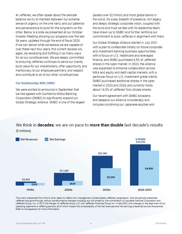 Net Revenues Net Earnings  $3,594  6 YEARS  $37,299  $352  $4,838  We think in decades; we are on pace to more than double last decade’s results  ($ millions)  $11,285  $635  $27,185  $2,394  20 25 SH A R EHO L D ER L E T T ER   2  JEFFER I E S  At Jefferies, we often speak about the delicate balance we try to maintain between our extreme sense of urgency on the one hand, and our patience and perseverance to build for the long-term on the other. Below is a slide we presented at our October Investor Meeting showing our progress over the last 36 years, updated through the end of fiscal 2025.  If we can deliver what we believe we are capable of over these next four years, this current decade will, again, be rewarding and fulfilling in so many ways for all our constituencies. We are deeply committed to ensuring Jefferies continues to serve our clients,  build value for our shareholders, offer opportunity and meritocracy to our employee-partners, and respect and contribute to all of our other constituencies.  Our Relationship With SMBC  We were excited to announce in September that we had agreed with Sumitomo Mitsui Banking Corporation (SMBC) to significantly expand our  Global Strategic Alliance. SMBC is one of the largest  (assets over $2 trillion) and most global banks in the world. Its scale, breadth of presence, rich legacy and deeply strategic corporate vision, coupled with the bond and trust we feel with its leadership team, have drawn us to SMBC and further reinforce our  commitment to build Jefferies in alignment with them.  Our Global Strategic Alliance started in July 2021 with a plan to collaborate initially on future corporate and investment banking business opportunities, with a focus on U.S. healthcare and leveraged finance, and SMBC purchased 4.5% of Jefferies’ shares in the open market. In 2023, the Alliance  was expanded to enhance collaboration across M&A and equity and debt capital markets, with a particular focus on U.S. investment grade clients. SMBC purchased additional shares in the open market in 2023 and 2024, and currently holds about 14.3% of Jefferies’ fully diluted shares.  Our recent agreement with SMBC broadens and deepens our Alliance considerably and includes combining our Japanese equities and  1990s 2000s 2010s 2020-2025  This chart, presented from time to time, seeks to reflect how management contemplates Jefferies’ progression. Over the periods presented, Jefferies has gone through various transformative changes including, but not limited to, the combination of Leucadia National Corporation and Jefferies Group, Inc. in 2013, the merger of Jefferies Group LLC with Jefferies Financial Group Inc. in late 2022, and changes to the alignment of our operating segments in differing periods, all of which impact the comparability of the Net revenues and Net earnings presented across the periods. Refer to the appendix for more information.