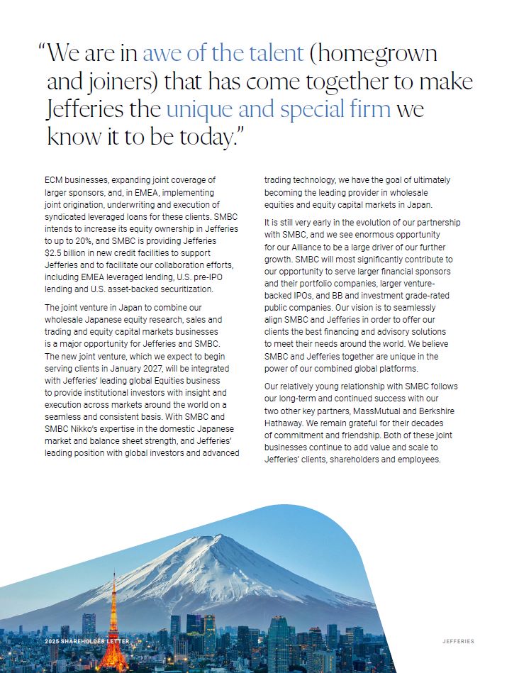 ECM businesses, expanding joint coverage of larger sponsors, and, in EMEA, implementing joint origination, underwriting and execution of  syndicated leveraged loans for these clients. SMBC intends to increase its equity ownership in Jefferies to up to 20%, and SMBC is providing Jefferies  $2.5 billion in new credit facilities to support Jefferies and to facilitate our collaboration efforts, including EMEA leveraged lending, U.S. pre-IPO lending and U.S. asset-backed securitization.  The joint venture in Japan to combine our wholesale Japanese equity research, sales and trading and equity capital markets businesses is a major opportunity for Jefferies and SMBC.  The new joint venture, which we expect to begin serving clients in January 2027, will be integrated with Jefferies’ leading global Equities business to provide institutional investors with insight and execution across markets around the world on a seamless and consistent basis. With SMBC and  SMBC Nikko’s expertise in the domestic Japanese market and balance sheet strength, and Jefferies’ leading position with global investors and advanced  20 25 SH A R EHO L D ER L E T T ER   2  JEFFER I E S  trading technology, we have the goal of ultimately becoming the leading provider in wholesale equities and equity capital markets in Japan.  It is still very early in the evolution of our partnership  with SMBC, and we see enormous opportunity  for our Alliance to be a large driver of our further growth. SMBC will most significantly contribute to our opportunity to serve larger financial sponsors and their portfolio companies, larger venture-backed IPOs, and BB and investment grade-rated public companies. Our vision is to seamlessly align SMBC and Jefferies in order to offer our clients the best financing and advisory solutions to meet their needs around the world. We believe SMBC and Jefferies together are unique in the power of our combined global platforms.  Our relatively young relationship with SMBC follows  our long-term and continued success with our two other key partners, MassMutual and Berkshire Hathaway. We remain grateful for their decades  of commitment and friendship. Both of these joint businesses continue to add value and scale to Jefferies’ clients, shareholders and employees.  “We are in awe of the talent (homegrown and joiners) that has come together to make Jefferies the unique and special firm we know it to be today.”