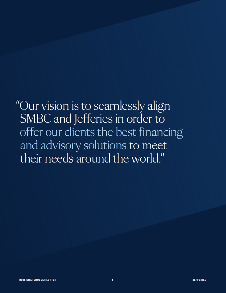 “Our vision is to seamlessly align SMBC and Jefferies in order to offer our clients the best financing and advisory solutions to meet their needs around the world.”  20 25 SH A R EHO L D ER L E T T ER   2  JEFFER I E S