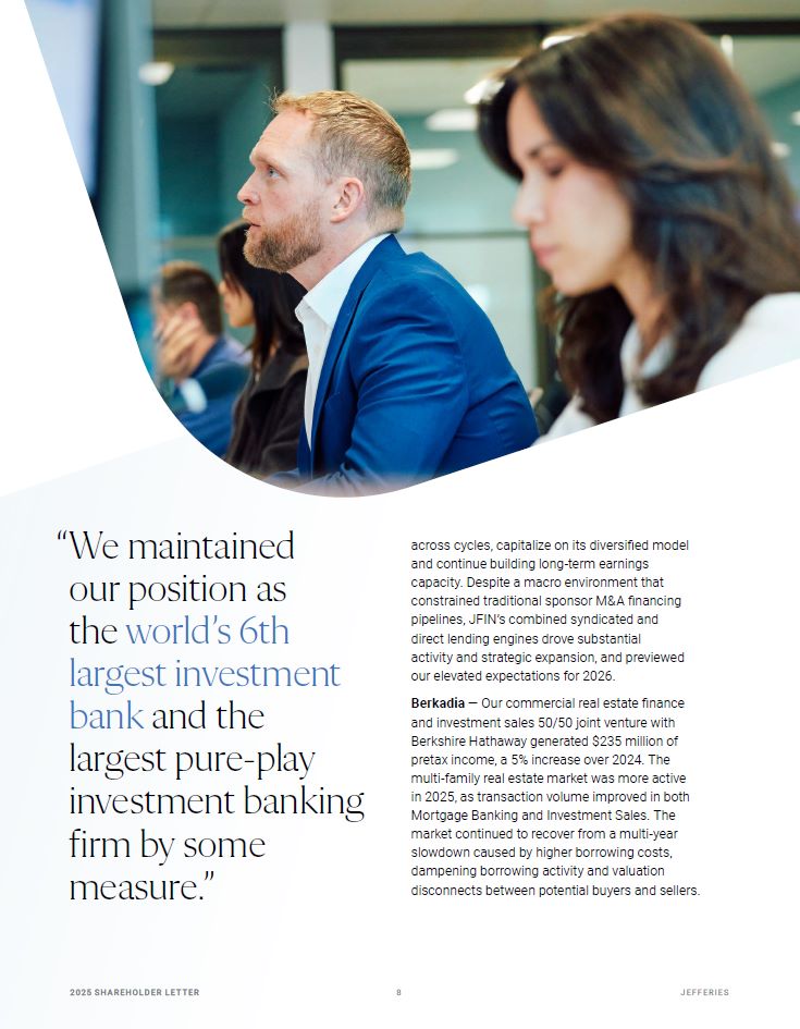 across cycles, capitalize on its diversified model and continue building long-term earnings capacity. Despite a macro environment that constrained traditional sponsor M&A financing pipelines, JFIN’s combined syndicated and direct lending engines drove substantial  activity and strategic expansion, and previewed our elevated expectations for 2026.  Berkadia — Our commercial real estate finance and investment sales 50/50 joint venture with Berkshire Hathaway generated $235 million of pretax income, a 5% increase over 2024. The multi-family real estate market was more active in 2025, as transaction volume improved in both Mortgage Banking and Investment Sales. The market continued to recover from a multi-year slowdown caused by higher borrowing costs, dampening borrowing activity and valuation  disconnects between potential buyers and sellers.  20 25 SH A R EHO L D ER L E T T ER   2  JEFFER I E S  “We maintained our position as the world’s 6th largest investment bank and the largest pure-play  investment banking firm by some measure.”
