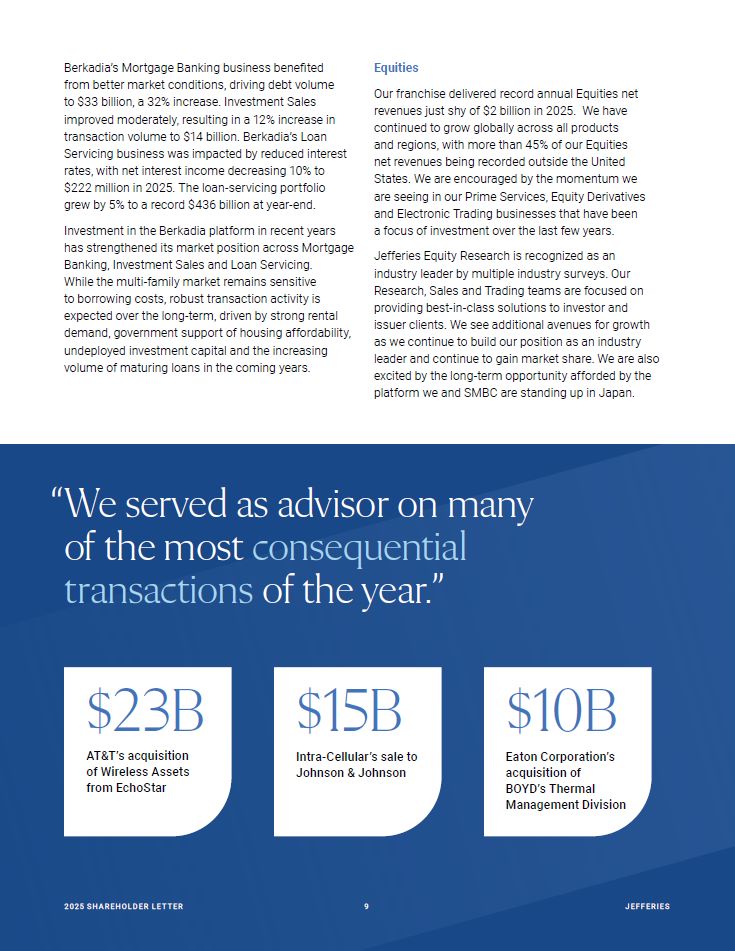 Berkadia’s Mortgage Banking business benefited from better market conditions, driving debt volume to $33 billion, a 32% increase. Investment Sales improved moderately, resulting in a 12% increase in transaction volume to $14 billion. Berkadia’s Loan Servicing business was impacted by reduced interest rates, with net interest income decreasing 10% to  $222 million in 2025. The loan-servicing portfolio  grew by 5% to a record $436 billion at year-end.  Investment in the Berkadia platform in recent years has strengthened its market position across Mortgage Banking, Investment Sales and Loan Servicing.  While the multi-family market remains sensitive to borrowing costs, robust transaction activity is  expected over the long-term, driven by strong rental demand, government support of housing affordability, undeployed investment capital and the increasing volume of maturing loans in the coming years.  Equities  Our franchise delivered record annual Equities net revenues just shy of $2 billion in 2025. We have continued to grow globally across all products and regions, with more than 45% of our Equities net revenues being recorded outside the United States. We are encouraged by the momentum we  are seeing in our Prime Services, Equity Derivatives and Electronic Trading businesses that have been a focus of investment over the last few years.  Jefferies Equity Research is recognized as an industry leader by multiple industry surveys. Our Research, Sales and Trading teams are focused on providing best-in-class solutions to investor and issuer clients. We see additional avenues for growth as we continue to build our position as an industry leader and continue to gain market share. We are also excited by the long-term opportunity afforded by the  platform we and SMBC are standing up in Japan.  “We served as advisor on many of the most consequential transactions of the year.”  $23B  AT&T’s acquisition of Wireless Assets from EchoStar  20 25 SH A R EHO L D ER L E T T ER JEFFER I E S9  20 25 SH A R EHO L D ER L E T T ER   9  JEFFER I E S  $15B  Intra-Cellular’s sale to Johnson & Johnson  $10B  Eaton Corporation’s acquisition of BOYD’s Thermal  Management Division