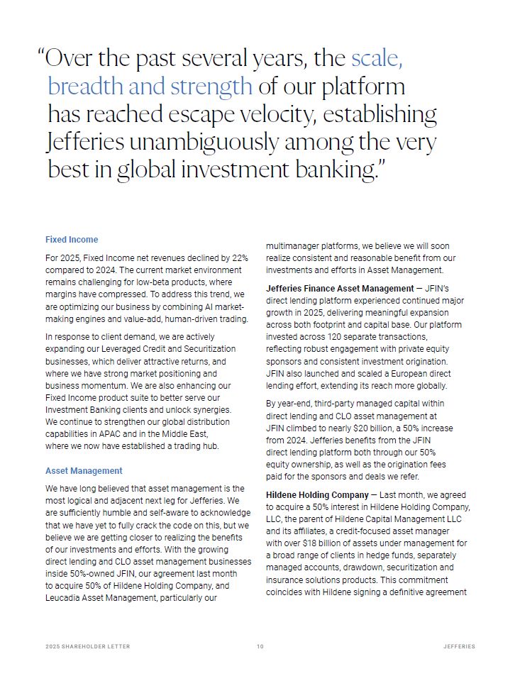 “Over the past several years, the scale, breadth and strength of our platform has reached escape velocity, establishing Jefferies unambiguously among the very best in global investment banking.”  20 25 SH A R EHO L D ER L E T T ER   10   JEFFER I E S  Fixed Income  For 2025, Fixed Income net revenues declined by 22% compared to 2024. The current market environment remains challenging for low-beta products, where margins have compressed. To address this trend, we are optimizing our business by combining AI market-making engines and value-add, human-driven trading.  In response to client demand, we are actively expanding our Leveraged Credit and Securitization businesses, which deliver attractive returns, and where we have strong market positioning and business momentum. We are also enhancing our Fixed Income product suite to better serve our Investment Banking clients and unlock synergies. We continue to strengthen our global distribution capabilities in APAC and in the Middle East,  where we now have established a trading hub.  Asset Management  We have long believed that asset management is the most logical and adjacent next leg for Jefferies. We are sufficiently humble and self-aware to acknowledge that we have yet to fully crack the code on this, but we believe we are getting closer to realizing the benefits of our investments and efforts. With the growing direct lending and CLO asset management businesses inside 50%-owned JFIN, our agreement last month  to acquire 50% of Hildene Holding Company, and Leucadia Asset Management, particularly our  multimanager platforms, we believe we will soon realize consistent and reasonable benefit from our investments and efforts in Asset Management.  Jefferies Finance Asset Management — JFIN’s direct lending platform experienced continued major growth in 2025, delivering meaningful expansion across both footprint and capital base. Our platform invested across 120 separate transactions, reflecting robust engagement with private equity sponsors and consistent investment origination.  JFIN also launched and scaled a European direct lending effort, extending its reach more globally.  By year-end, third-party managed capital within direct lending and CLO asset management at JFIN climbed to nearly $20 billion, a 50% increase from 2024. Jefferies benefits from the JFIN direct lending platform both through our 50% equity ownership, as well as the origination fees paid for the sponsors and deals we refer.  Hildene Holding Company — Last month, we agreed to acquire a 50% interest in Hildene Holding Company, LLC, the parent of Hildene Capital Management LLC and its affiliates, a credit-focused asset manager  with over $18 billion of assets under management for a broad range of clients in hedge funds, separately managed accounts, drawdown, securitization and insurance solutions products. This commitment coincides with Hildene signing a definitive agreement