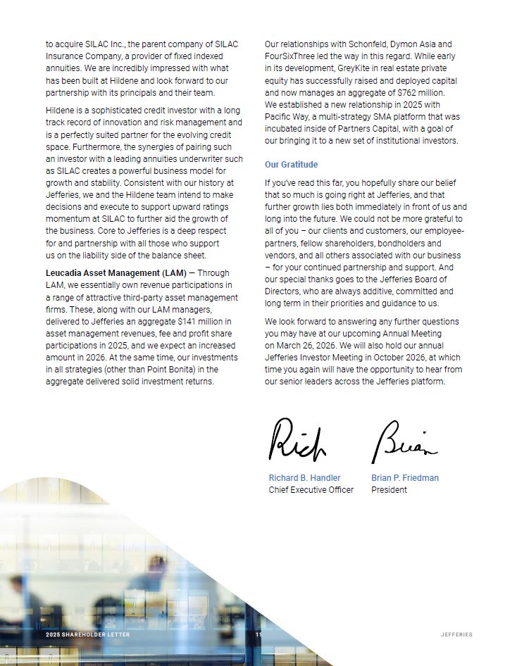 to acquire SILAC Inc., the parent company of SILAC Insurance Company, a provider of fixed indexed annuities. We are incredibly impressed with what has been built at Hildene and look forward to our partnership with its principals and their team.  Hildene is a sophisticated credit investor with a long track record of innovation and risk management and is a perfectly suited partner for the evolving credit space. Furthermore, the synergies of pairing such an investor with a leading annuities underwriter such as SILAC creates a powerful business model for growth and stability. Consistent with our history at Jefferies, we and the Hildene team intend to make decisions and execute to support upward ratings momentum at SILAC to further aid the growth of  the business. Core to Jefferies is a deep respect for and partnership with all those who support us on the liability side of the balance sheet.  Leucadia Asset Management (LAM) — Through LAM, we essentially own revenue participations in a range of attractive third-party asset management firms. These, along with our LAM managers, delivered to Jefferies an aggregate $141 million in asset management revenues, fee and profit share participations in 2025, and we expect an increased amount in 2026. At the same time, our investments in all strategies (other than Point Bonita) in the aggregate delivered solid investment returns.  Our relationships with Schonfeld, Dymon Asia and FourSixThree led the way in this regard. While early in its development, GreyKite in real estate private equity has successfully raised and deployed capital and now manages an aggregate of $762 million.  We established a new relationship in 2025 with Pacific Way, a multi-strategy SMA platform that was incubated inside of Partners Capital, with a goal of our bringing it to a new set of institutional investors.  Our Gratitude  If you’ve read this far, you hopefully share our belief that so much is going right at Jefferies, and that further growth lies both immediately in front of us and long into the future. We could not be more grateful to all of you – our clients and customers, our employee-partners, fellow shareholders, bondholders and vendors, and all others associated with our business – for your continued partnership and support. And our special thanks goes to the Jefferies Board of Directors, who are always additive, committed and long term in their priorities and guidance to us.  We look forward to answering any further questions you may have at our upcoming Annual Meeting  on March 26, 2026. We will also hold our annual Jefferies Investor Meeting in October 2026, at which time you again will have the opportunity to hear from our senior leaders across the Jefferies platform.  Richard B. Handler  Chief Executive Officer  Brian P. Friedman  President  20 25 SH A R EHO L D ER L E T T ER 11  20 25 SH A R EHO L D ER L E T T ER   11  JEFFER I E S