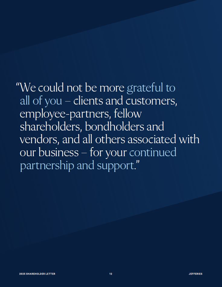 “We could not be more grateful to all of you – clients and customers, employee-partners, fellow shareholders, bondholders and  vendors, and all others associated with  our business – for your continued partnership and support.”  20 25 SH A R EHO L D ER L E T T ER   12  JEFFER I E S