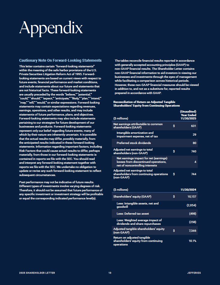 ($ millions) 11/30/2024  Shareholders’ equity (GAAP) $ 10,157  Less: Intangible assets, net and goodwill  (2,054)  Less: Deferred tax asset (498)  Less: Weighted average impact of dividends and share repurchases  (258)  Adjusted tangible shareholders’ equity (non-GAAP)  $  7,346  Return on adjusted tangible shareholders’ equity from continuing operations  10.1%  ($ millions)  20 25 SH A R EHO L D ER L E T T ER   12  JEFFER I E S  Net earnings attributable to common shareholders (GAAP)  $  631  Intangible amortization and impairment expense, net of tax  29  Preferred stock dividends 80  Adjusted net earnings to total shareholders (non-GAAP)  $ 740  Net earnings impact for net (earnings) losses from discontinued operations, net of noncontrolling interests  4  Adjusted net earnings to total  shareholders from continuing operations $ (non-GAAP)  744  Appendix  The tables reconcile financial results reported in accordance with generally accepted accounting principles (GAAP) to non-GAAP financial results. The Shareholder Letter contains  non-GAAP financial information to aid investors in viewing our businesses and investments through the eyes of management while facilitating a comparison across historical periods.  However, these non-GAAP financial measures should be viewed in addition to, and not as a substitute for, reported results prepared in accordance with GAAP.  Reconciliation of Return on Adjusted Tangible Shareholders’ Equity from Continuing Operations  (Unaudited) Year Ended 11/30/2025  Cautionary Note On Forward-Looking Statements  This letter contains certain “forward-looking statements” within the meaning of the safe harbor provisions of the U.S. Private Securities Litigation Reform Act of 1995. Forward-looking statements are based on current views with respect to future events, financial performance and market conditions, and include statements about our future and statements that are not historical facts. These forward-looking statements  are usually preceded by the words “believe,” “potential,” “could,” “should,” “expect,” “anticipate,” “likely,” “plan,” “intend,” “may,” “will,” “would,” or similar expressions. Forward-looking statements may contain expectations regarding revenues, earnings, operations, and other results, and may include statements of future performance, plans, and objectives.  Forward-looking statements may also include statements pertaining to our strategies for future development of our businesses and products. Forward-looking statements represent only our belief regarding future events, many of which by their nature are inherently uncertain. It is possible that the actual results may differ, possibly materially, from the anticipated results indicated in these forward-looking  statements. Information regarding important factors, including Risk Factors that could cause actual results to differ, perhaps materially, from those in our forward-looking statements is contained in reports we file with the SEC. You should read  and interpret any forward-looking statement together with reports we file with the SEC. We undertake no obligation to update or revise any such forward-looking statement to reflect subsequent circumstances.  Past performance may not be indicative of future results. Different types of investments involve varying degrees of risk. Therefore, it should not be assumed that future performance of any specific investment or investment strategy will be profitable or equal the corresponding indicated performance level(s).