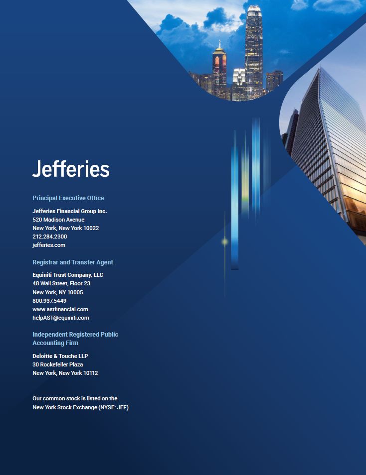 Principal Executive Office  Jefferies Financial Group Inc.  520 Madison Avenue  New York, New York 10022  212.284.2300  jefferies.com  Registrar and Transfer Agent  Equiniti Trust Company, LLC  48 Wall Street, Floor 23 New York, NY 10005 800.937.5449  www.astfinancial.com  helpAST@equiniti.com  Independent Registered Public Accounting Firm  Deloitte & Touche LLP  30 Rockefeller Plaza  New York, New York 10112  Our common stock is listed on the  New York Stock Exchange (NYSE: JEF)