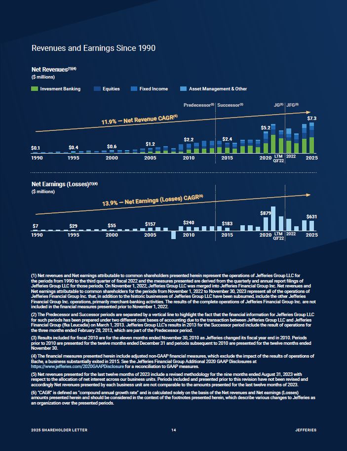 Revenues and Earnings Since 1990  Net Revenues(1)(4)  ($ millions)  Invesment Banking  Equities  Fixed Income  Asset Management & Other  $0.1  1990  $0.4  1995  $0.6  2000  $1.2  2005  $2.2  2010  $2.4  2015  $5.2  $7.3  2025  Predecessor(2) Successor(2)  JG(5) JFG(5)  11.9% — Net Revenue CAGR  (6)  2020 LTM 2022  Q3’22  $7  1990  $29  1995  $55  2000  $157  2005  $240  2010  $183  2015  $879  $631  2025  13.9% — Net Earnings (Losses) CAGR  (6)  2020 LTM 2022  Q3’22  Net Earnings (Losses)(1)(4)  ($ millions)  Net revenues and Net earnings attributable to common shareholders presented herein represent the operations of Jefferies Group LLC for  the periods from 1990 to the third quarter of fiscal 2022 and the measures presented are derived from the quarterly and annual report filings of Jefferies Group LLC for those periods. On November 1, 2022, Jefferies Group LLC was merged into Jefferies Financial Group Inc. Net revenues and Net earnings attributable to common shareholders for the periods from November 1, 2022 to November 30, 2023 represent all of the operations of Jefferies Financial Group Inc. that, in addition to the historic businesses of Jefferies Group LLC have been subsumed, include the other Jefferies Financial Group Inc. operations, primarily merchant-banking activities. The results of the complete operations of Jefferies Financial Group Inc. are not included in the financial measures presented prior to November 1, 2022.  The Predecessor and Successor periods are separated by a vertical line to highlight the fact that the financial information for Jefferies Group LLC for such periods has been prepared under two different cost bases of accounting due to the transaction between Jefferies Group LLC and Jefferies Financial Group (fka Leucadia) on March 1, 2013. Jefferies Group LLC’s results in 2013 for the Successor period include the result of operations for the three months ended February 28, 2013, which are part of the Predecessor period.  Results included for fiscal 2010 are for the eleven months ended November 30, 2010 as Jefferies changed its fiscal year end in 2010. Periods prior to 2010 are presented for the twelve months ended December 31 and periods subsequent to 2010 are presented for the twelve months ended November 30.  The financial measures presented herein include adjusted non-GAAP financial measures, which exclude the impact of the results of operations of Bache, a business substantially exited in 2015. See the Jefferies Financial Group Additional 2020 GAAP Disclosures at https://www.jefferies.com/2020GAAPDisclosure for a reconciliation to GAAP measures.  Net revenues presented for the last twelve months of 2023 include a revised methodology for the nine months ended August 31, 2023 with respect to the allocation of net interest across our business units. Periods included and presented prior to this revision have not been revised and accordingly Net revenues presented by each business unit are not comparable to the amounts presented for the last twelve months of 2023.  “CAGR” is defined as “compound annual growth rate” and is calculated solely on the basis of the Net revenues and Net earnings (Losses) amounts presented herein and should be considered in the context of the footnotes presented herein, which describe various changes to Jefferies as an organization over the presented periods.  20 25 SH A R EHO L D ER L E T T ER   12  JEFFER I E S
