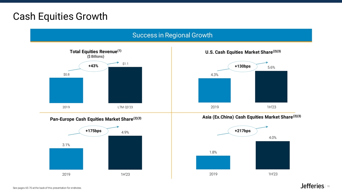 Investment Banking Growth In a cyclical downturn for …we have grown revenue… …and improved our market position Investment Banking… (1) (2) Market Size Core Investment Banking Revenue JEF Market Position ($ Billions) ($ Billions) M&A, ECM & LevFin LTM Q2’23 2019 -15% +40% $57.3 $2.1 Global $48.7 #12 #7 Advisory, ECM (3) & DCM Global $1.5 Advisory & #10 #6 (3) ECM 2019 LTM Q3'23 2019 LTM Q3'23 10 See pages 65-70 at the back of this presentation for endnotes.