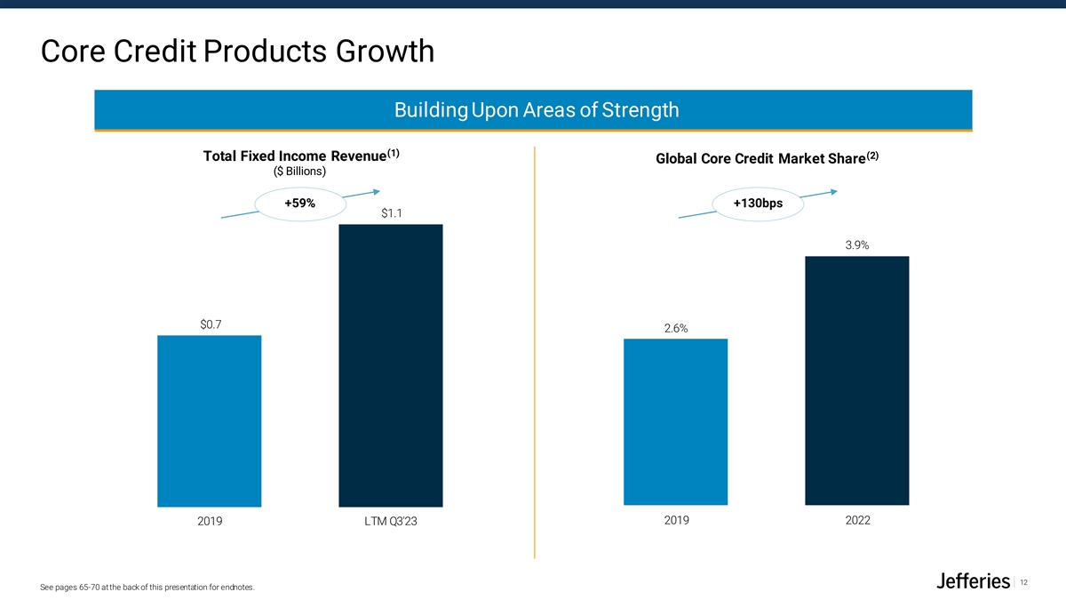 Cash Equities Growth Success in Regional Growth (1) (2)(3) Total Equities Revenue U.S. Cash Equities Market Share ($ Billions) $1.1 +43% +130bps 5.6% $0.8 4.3% 2019 LTM Q3'23 2019 1H'23 (2)(3) Asia (Ex.China) Cash Equities Market Share (2)(3) Pan-Europe Cash Equities Market Share +175bps +217bps 4.9% 4.0% 3.1% 1.8% 2019 1H'23 2019 1H'23 11 See pages 65-70 at the back of this presentation for endnotes.