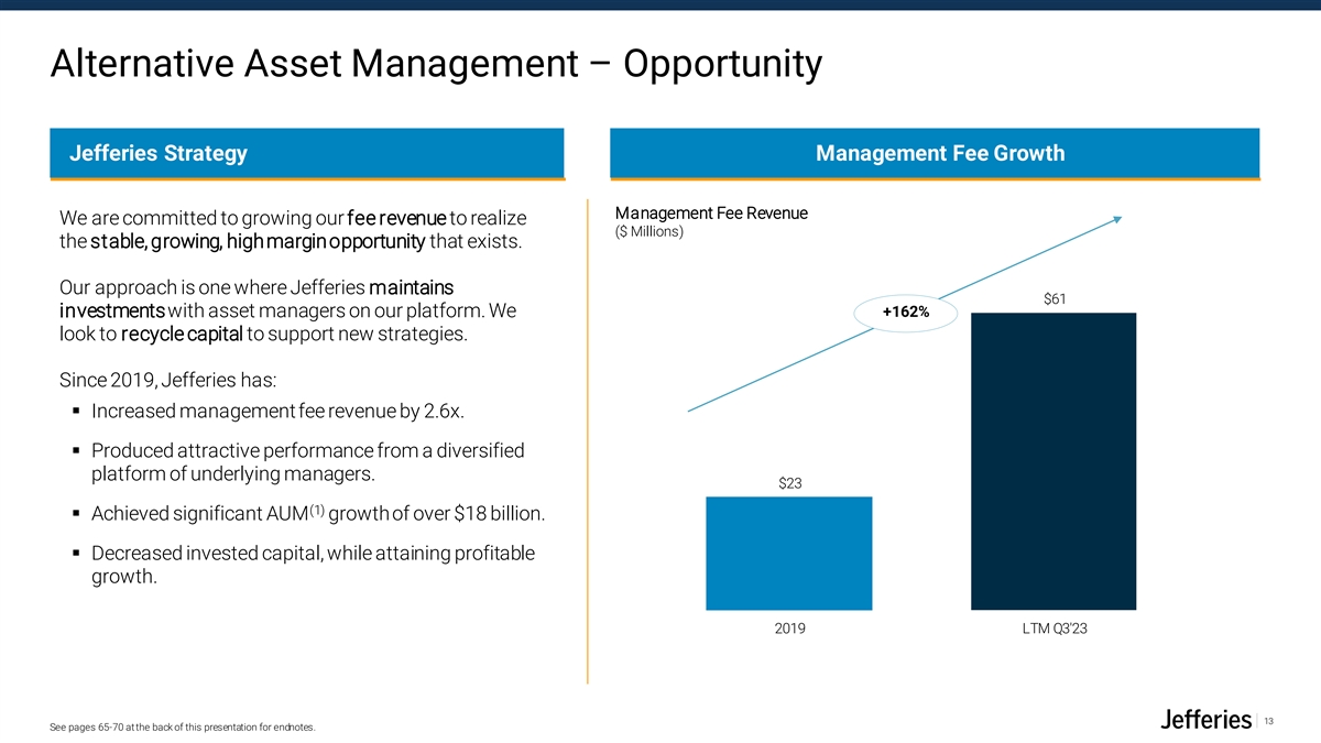 Core Credit Products Growth Building Upon Areas of Strength (1) (2) Total Fixed Income Revenue Global Core Credit Market Share ($ Billions) +59% +130bps $1.1 3.9% $0.7 2.6% 2019 2022 2019 LTM Q3'23 12 See pages 65-70 at the back of this presentation for endnotes.