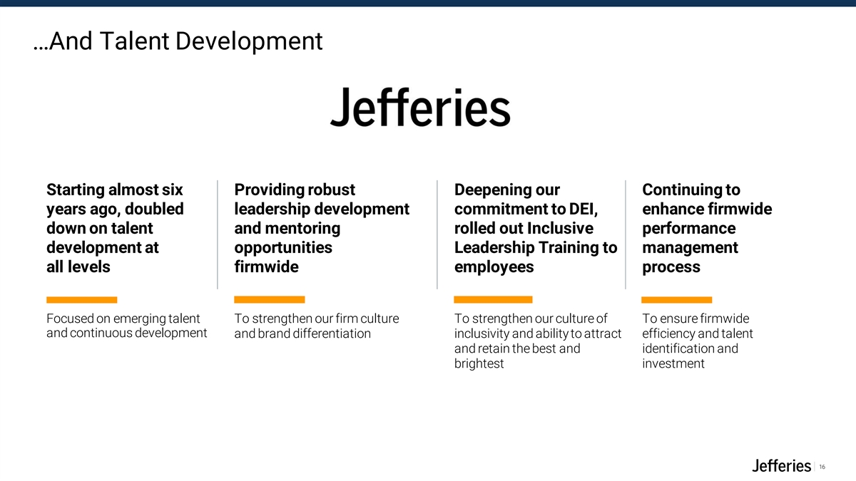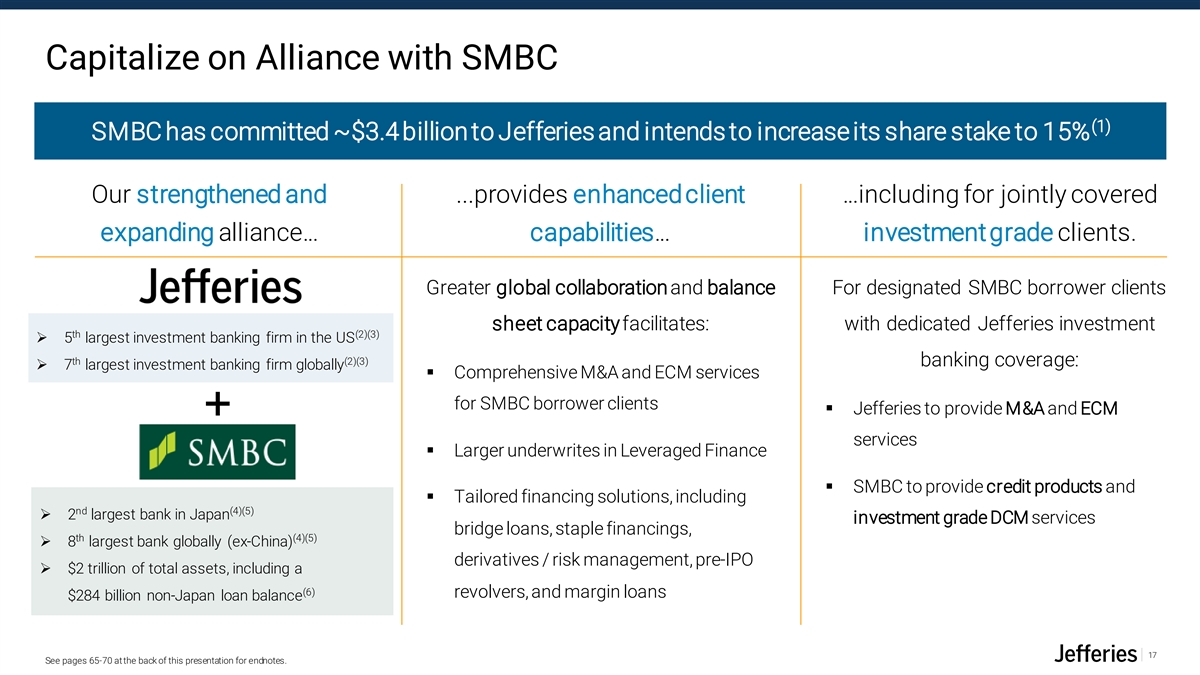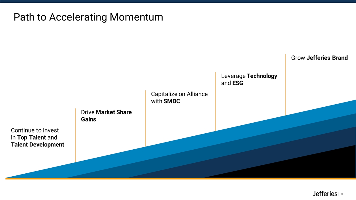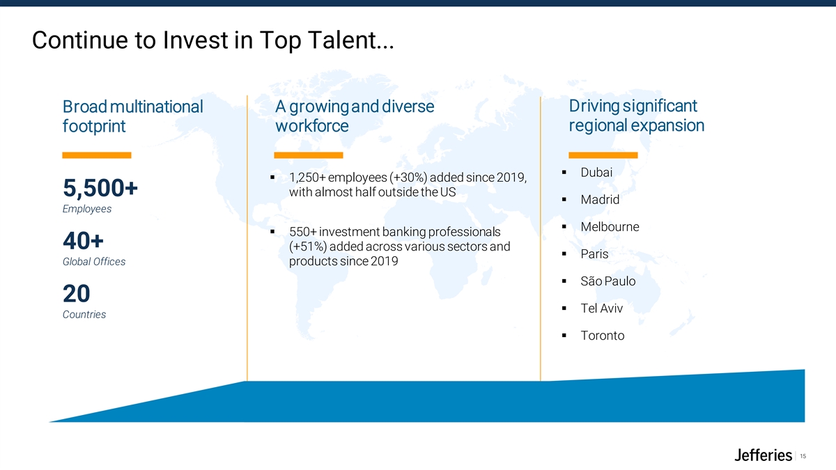 Path to Accelerating Momentum Grow Jefferies Brand Leverage Technology and ESG Capitalize on Alliance with SMBC Drive Market Share Gains Continue to Invest in Top Talent and Talent Development 14