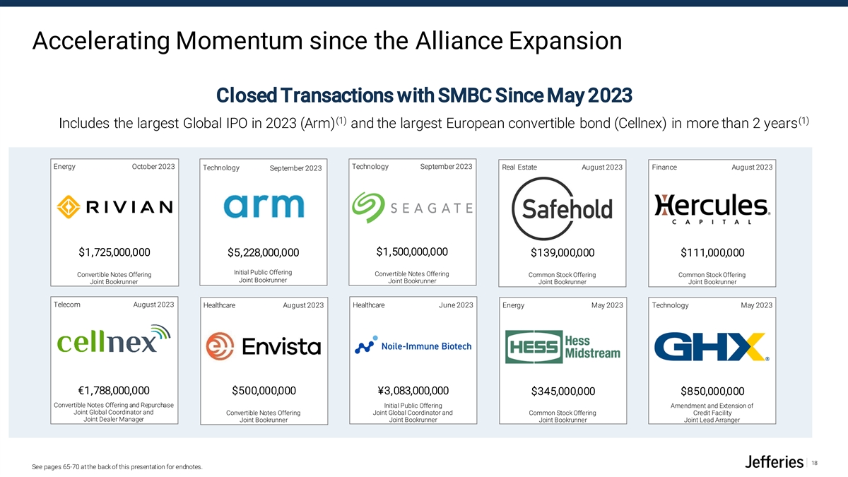 Capitalize on Alliance with SMBC (1) SMBC has committed ~$3.4 billion to Jefferies and intends to increase its share stake to 15% Our strengthened and ...provides enhancedclient …including for jointly covered expanding alliance… capabilities… investment grade clients. Greater global collaboration and balance For designated SMBC borrower clients sheet capacityfacilitates: with dedicated Jefferies investment th (2)(3) ➢ 5 largest investment banking firm in the US th (2)(3) banking coverage: ➢ 7 largest investment banking firm globally ▪ Comprehensive M&A and ECM services for SMBC borrower clients ▪ Jefferies to provide M&A and ECM + services ▪ Larger underwrites in Leveraged Finance ▪ SMBC to provide credit products and ▪ Tailored financing solutions, including nd (4)(5) ➢ 2 largest bank in Japan investment grade DCM services bridge loans, staple financings, th (4)(5) ➢ 8 largest bank globally (ex-China) derivatives / risk management, pre-IPO ➢ $2 trillion of total assets, including a (6) revolvers, and margin loans $284 billion non-Japan loan balance 17 See pages 65-70 at the back of this presentation for endnotes.