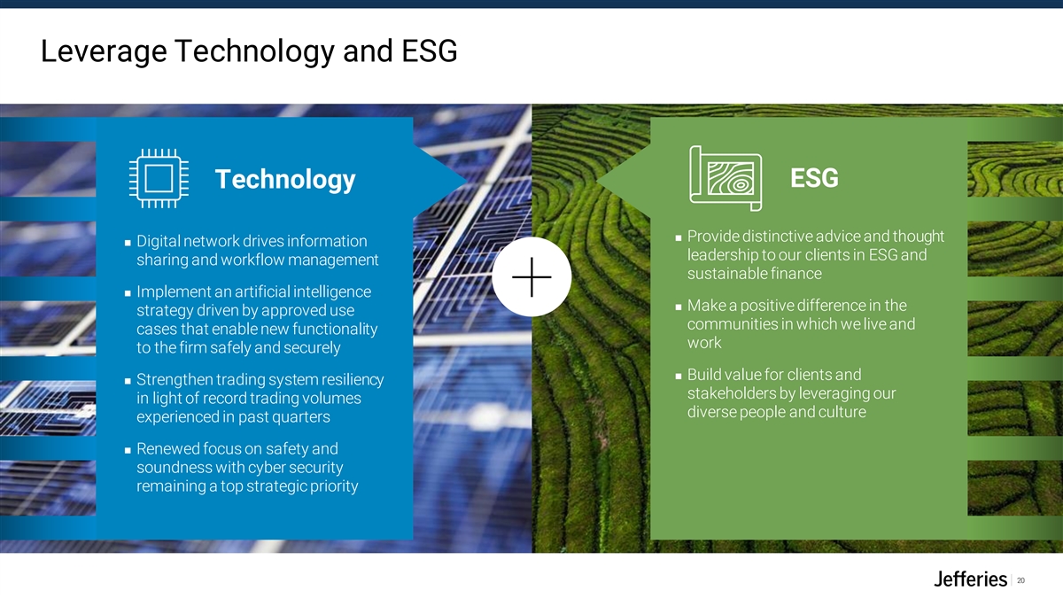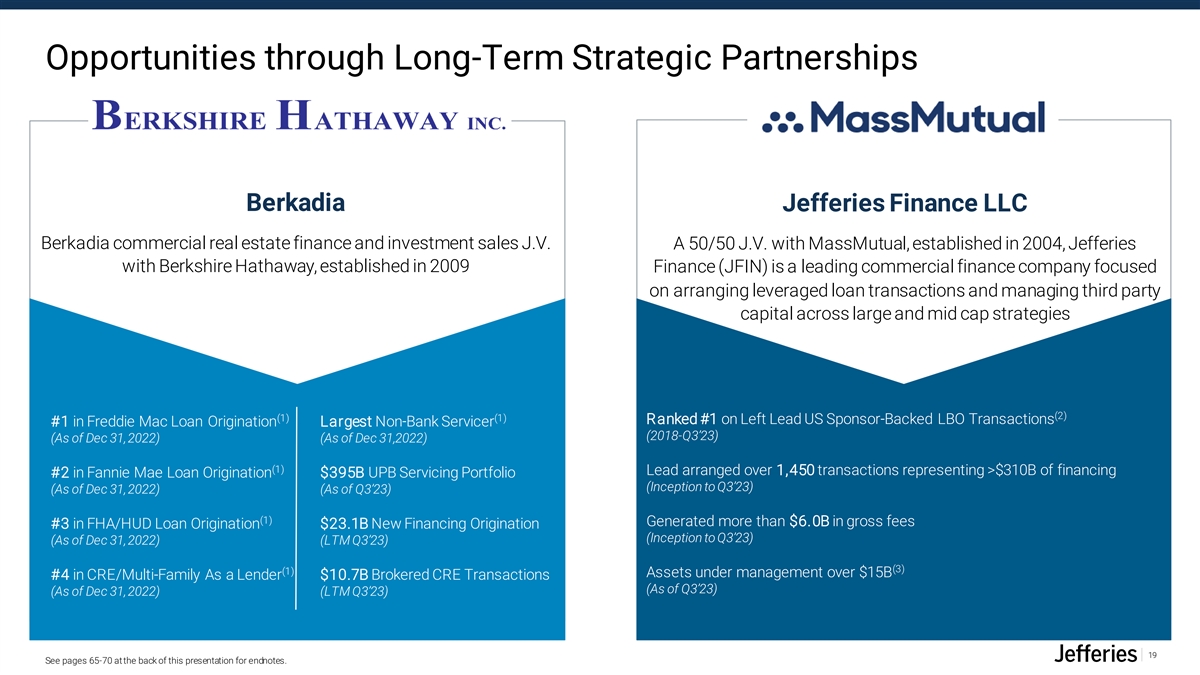Opportunities through Long-Term Strategic Partnerships Berkadia Jefferies Finance LLC Berkadia commercial real estate finance and investment sales J.V. A 50/50 J.V. with MassMutual, established in 2004, Jefferies with Berkshire Hathaway, established in 2009 Finance (JFIN) is a leading commercial finance company focused on arranging leveraged loan transactions and managing third party capital across large and mid cap strategies (2) (1) (1) Ranked #1 on Left Lead US Sponsor-Backed LBO Transactions #1 in Freddie Mac Loan Origination Largest Non-Bank Servicer (2018-Q3’23) (As of Dec 31, 2022) (As of Dec 31,2022) (1) Lead arranged over 1,450 transactions representing >$310B of financing #2 in Fannie Mae Loan Origination $395B UPB Servicing Portfolio (Inception to Q3’23) (As of Dec 31, 2022) (As of Q3’23) (1) Generated more than $6.0B in gross fees #3 in FHA/HUD Loan Origination $23.1B New Financing Origination (Inception to Q3’23) (As of Dec 31, 2022) (LTM Q3’23) (3) (1) Assets under management over $15B #4 in CRE/Multi-Family As a Lender $10.7B Brokered CRE Transactions (As of Q3’23) (As of Dec 31, 2022) (LTM Q3’23) 19 See pages 65-70 at the back of this presentation for endnotes.