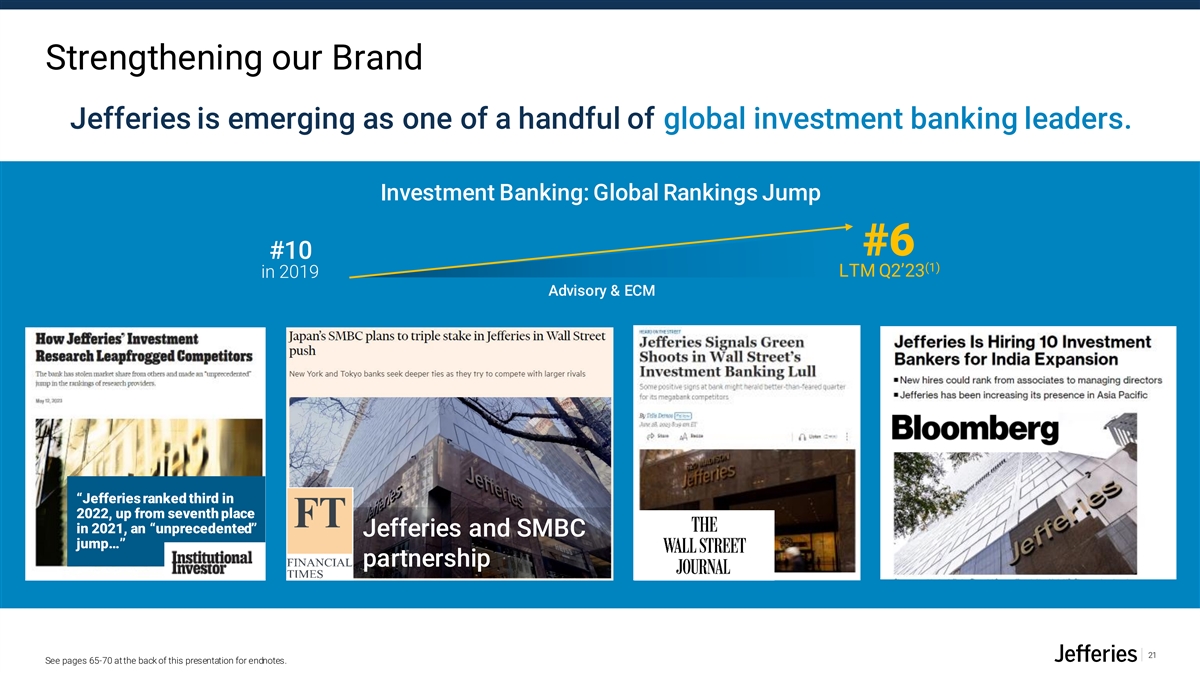 Strengthening our Brand Jefferies is emerging as one of a handful of global investment banking leaders. Investment Banking: Global Rankings Jump #6 #10 (1) LTM Q2’23 in 2019 Advisory & ECM “Jefferies ranked third in 2022, up from seventh place in 2021, an “unprecedented” Jefferies and SMBC jump…” partnership 21 See pages 65-70 at the back of this presentation for endnotes.
