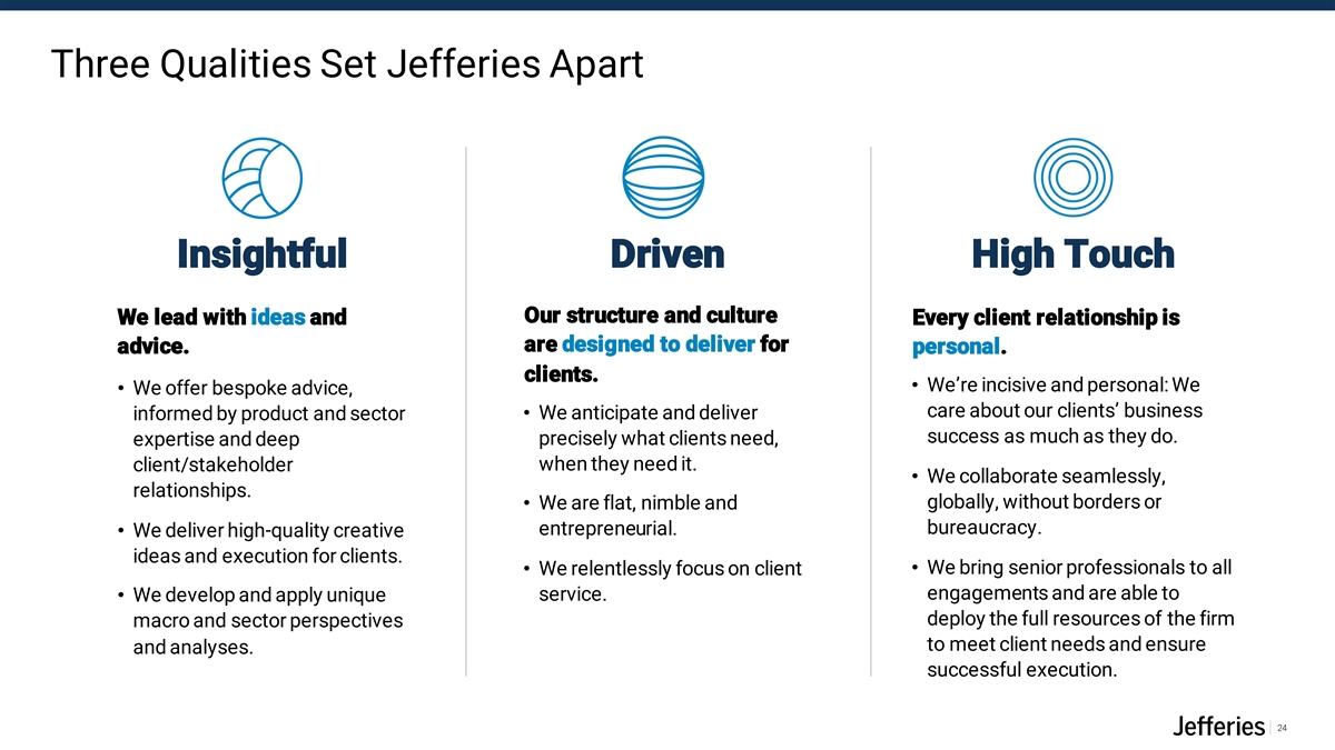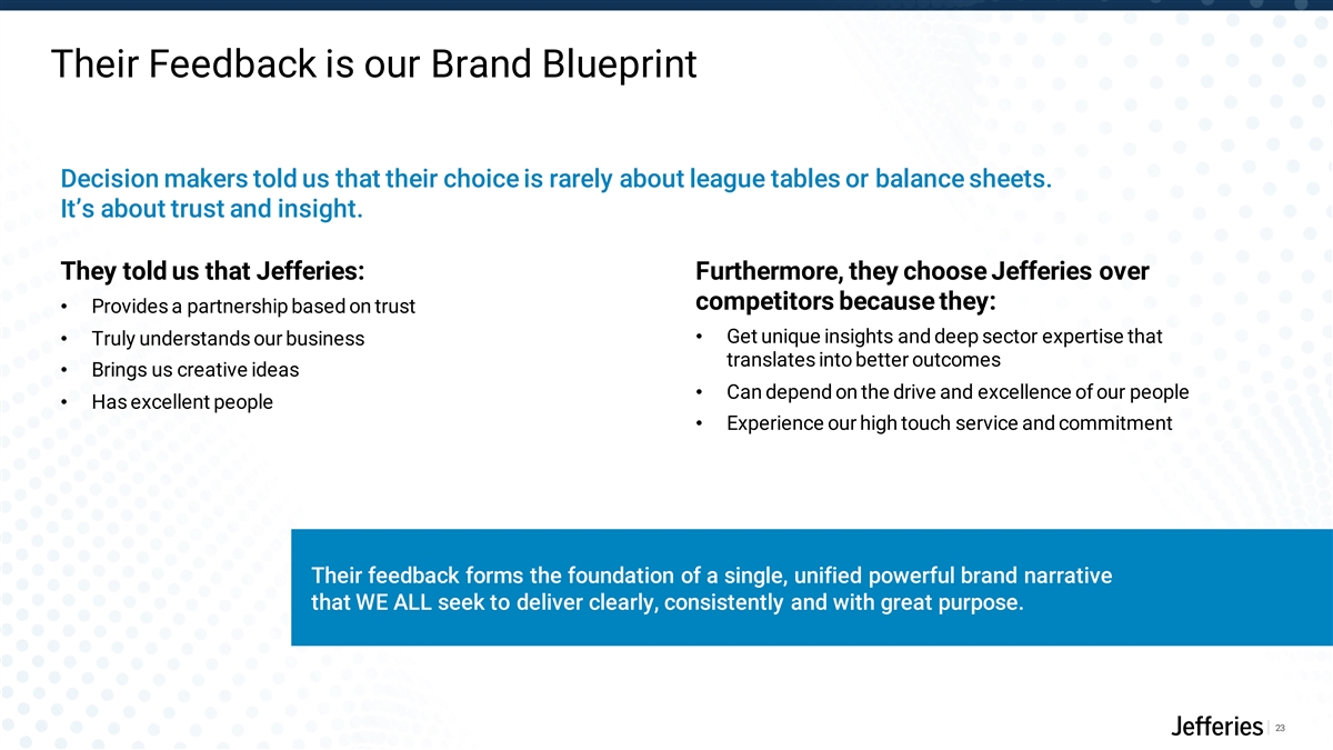 Their Feedback is our Brand Blueprint Decision makers told us that their choice is rarely about league tables or balance sheets. It’s about trust and insight. They told us that Jefferies: Furthermore, they choose Jefferies over competitors because they: • Provides a partnership based on trust • Get unique insights and deep sector expertise that • Truly understands our business translates into better outcomes • Brings us creative ideas • Can depend on the drive and excellence of our people • Has excellent people • Experience our high touch service and commitment Their feedback forms the foundation of a single, unified powerful brand narrative that WE ALL seek to deliver clearly, consistently and with great purpose. 23