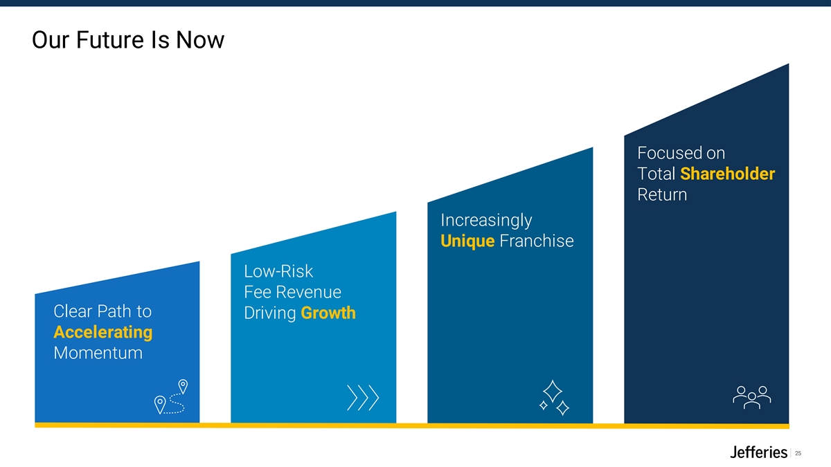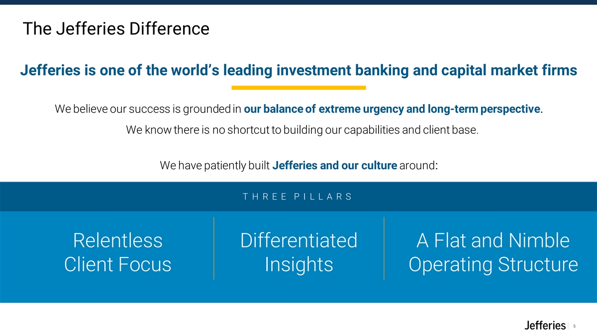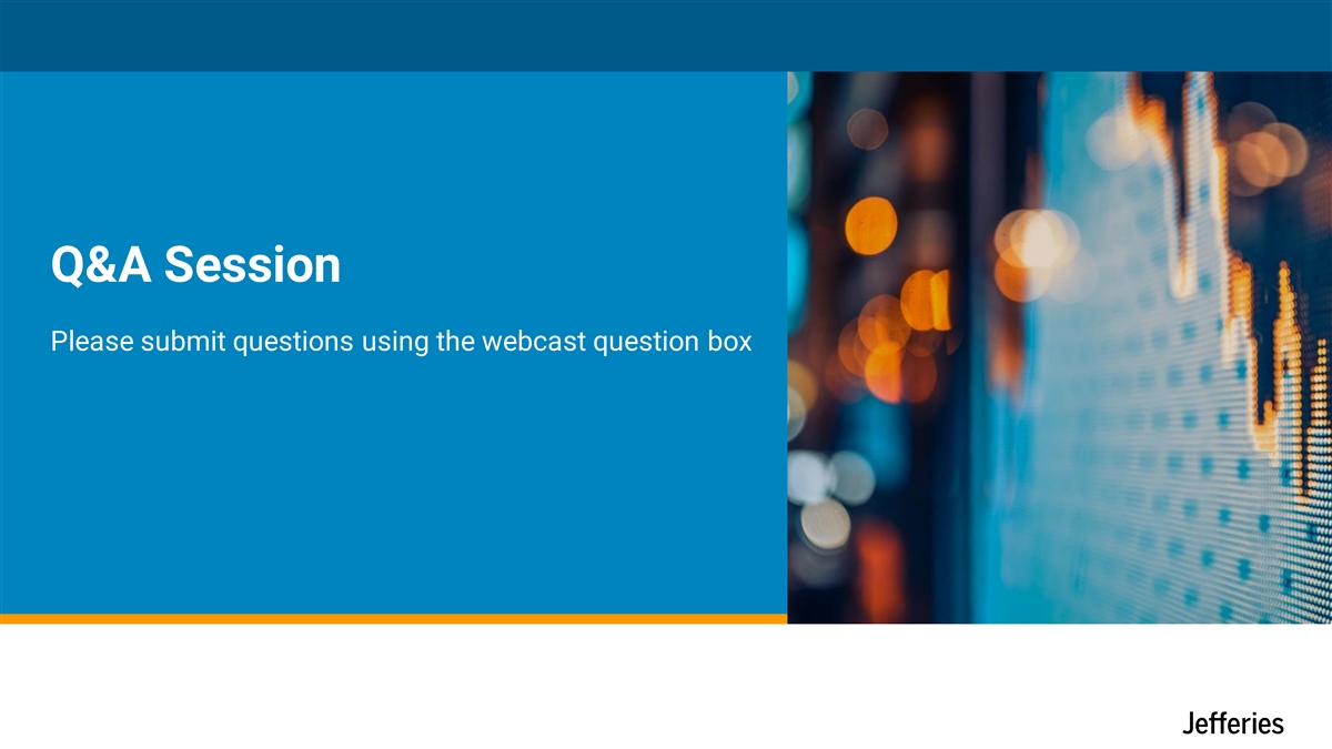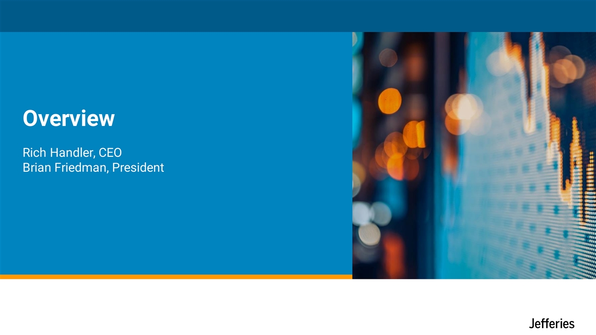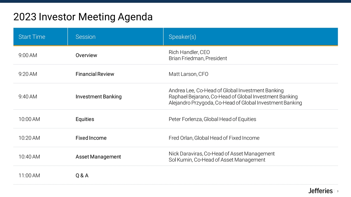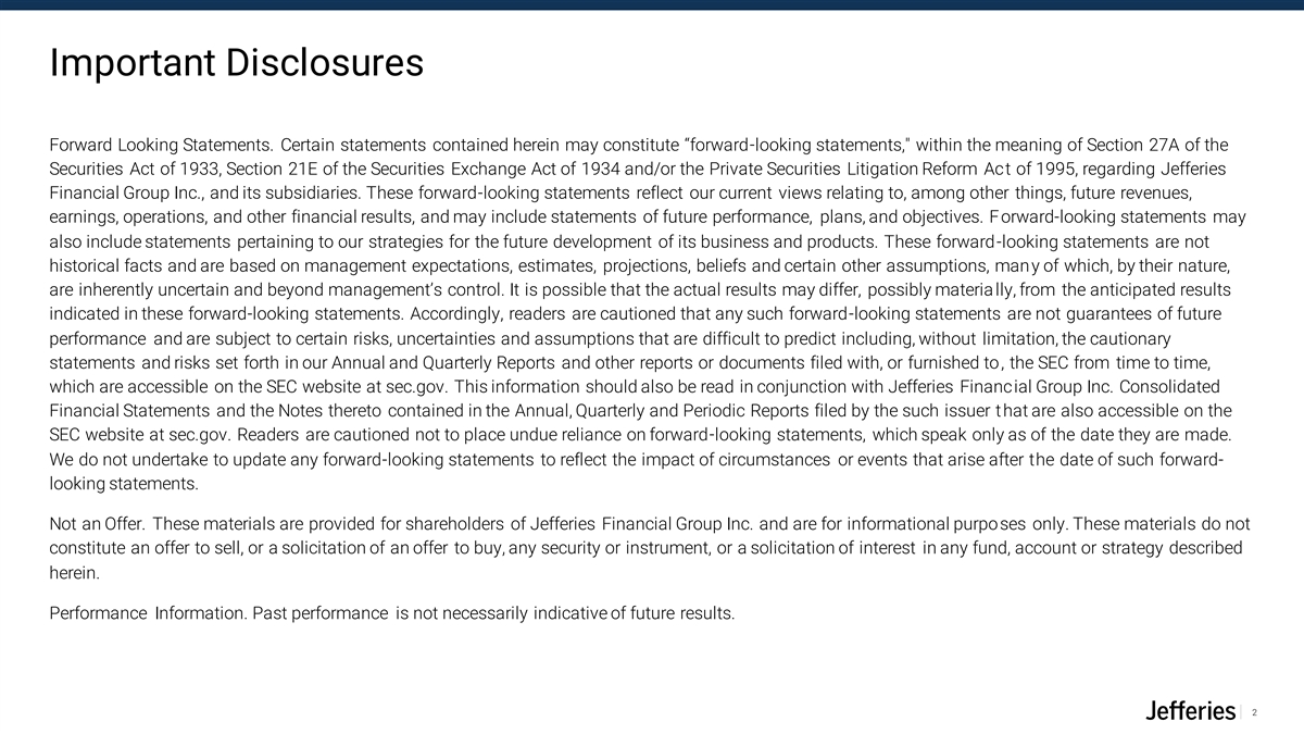 Important Disclosures Forward Looking Statements. Certain statements contained herein may constitute “forward-looking statements, within the meaning of Section 27A of the Securities Act of 1933, Section 21E of the Securities Exchange Act of 1934 and/or the Private Securities Litigation Reform Act of 1995, regarding Jefferies Financial Group Inc., and its subsidiaries. These forward-looking statements reflect our current views relating to, among other things, future revenues, earnings, operations, and other financial results, and may include statements of future performance, plans, and objectives. Forward-looking statements may also include statements pertaining to our strategies for the future development of its business and products. These forward-looking statements are not historical facts and are based on management expectations, estimates, projections, beliefs and certain other assumptions, many of which, by their nature, are inherently uncertain and beyond management’s control. It is possible that the actual results may differ, possibly materially, from the anticipated results indicated in these forward-looking statements. Accordingly, readers are cautioned that any such forward-looking statements are not guarantees of future performance and are subject to certain risks, uncertainties and assumptions that are difficult to predict including, without limitation, the cautionary statements and risks set forth in our Annual and Quarterly Reports and other reports or documents filed with, or furnished to, the SEC from time to time, which are accessible on the SEC website at sec.gov. This information should also be read in conjunction with Jefferies Financial Group Inc. Consolidated Financial Statements and the Notes thereto contained in the Annual, Quarterly and Periodic Reports filed by the such issuer that are also accessible on the SEC website at sec.gov. Readers are cautioned not to place undue reliance on forward-looking statements, which speak only as of the date they are made. We do not undertake to update any forward-looking statements to reflect the impact of circumstances or events that arise after the date of such forward- looking statements. Not an Offer. These materials are provided for shareholders of Jefferies Financial Group Inc. and are for informational purposes only. These materials do not constitute an offer to sell, or a solicitation of an offer to buy, any security or instrument, or a solicitation of interest in any fund, account or strategy described herein. Performance Information. Past performance is not necessarily indicative of future results. 2