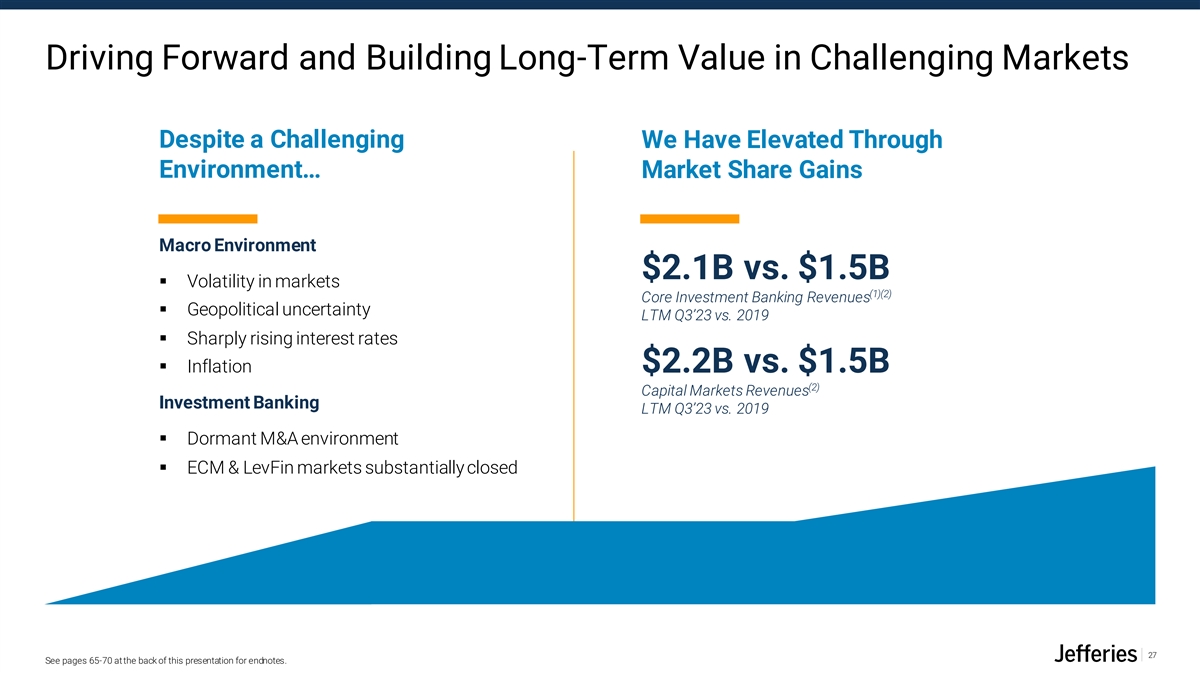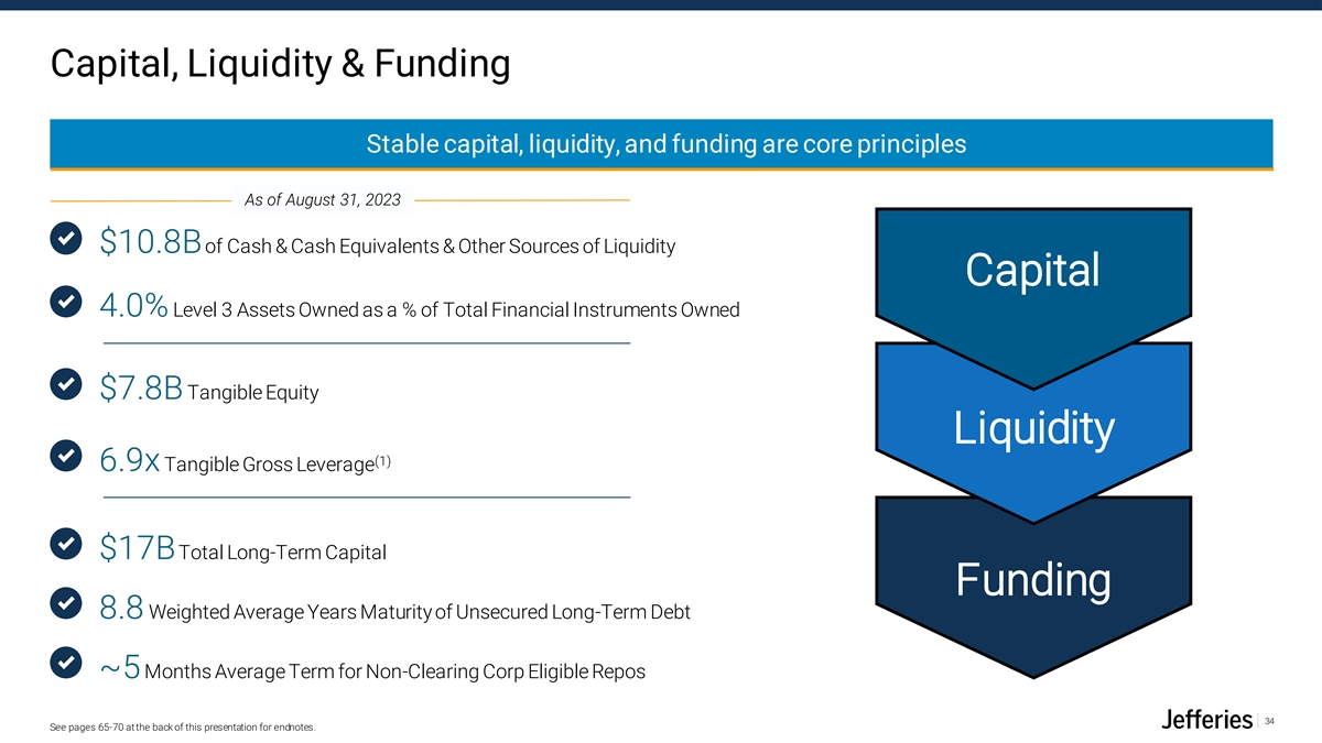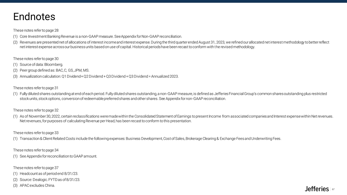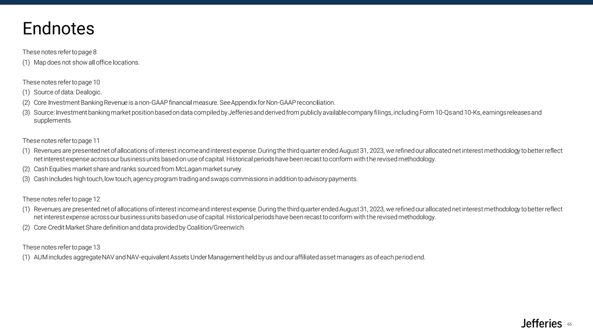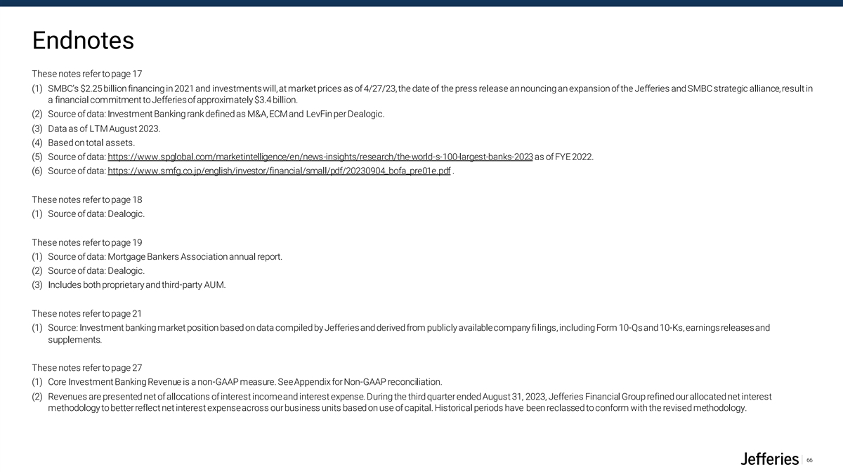 Endnotes These notes refer to page 8 (1) Map does not show all office locations. These notes refer to page 10 (1) Source of data: Dealogic. (2) Core Investment Banking Revenue is a non-GAAP financial measure. See Appendix for Non-GAAP reconciliation. (3) Source: Investment banking market position based on data compiled by Jefferies and derived from publicly available company filings, including Form 10-Qs and 10-Ks, earnings releases and supplements. These notes refer to page 11 (1) Revenues are presented net of allocations of interest income and interest expense. During the third quarter ended August 31, 2023, we refined our allocated net interest methodology to better reflect net interest expense across our business units based on use of capital. Historical periods have been recast to conform with the revised methodology. (2) Cash Equities market share and ranks sourced from McLagan market survey. (3) Cash includes high touch, low touch, agency program trading and swaps commissions in addition to advisory payments. These notes refer to page 12 (1) Revenues are presented net of allocations of interest income and interest expense. During the third quarter ended August 31, 2023, we refined our allocated net interest methodology to better reflect net interest expense across our business units based on use of capital. Historical periods have been recast to conform with the revised methodology. (2) Core Credit Market Share definition and data provided by Coalition/Greenwich. These notes refer to page 13 (1) AUM includes aggregate NAV and NAV-equivalent Assets Under Management held by us and our affiliated asset managers as of each period end. 65