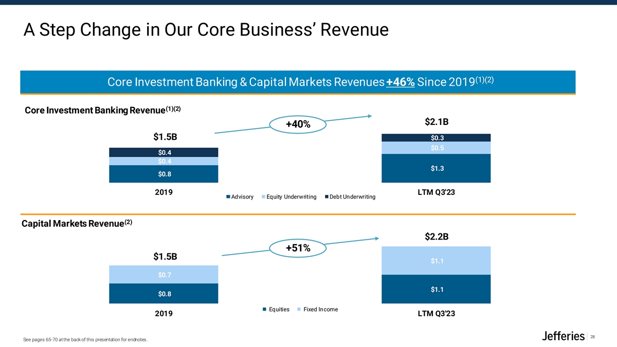 Driving Forward and Building Long-Term Value in Challenging Markets Despite a Challenging We Have Elevated Through Environment… Market Share Gains Macro Environment $2.1B vs. $1.5B ▪ Volatility in markets (1)(2) Core Investment Banking Revenues ▪ Geopolitical uncertainty LTM Q3’23 vs. 2019 ▪ Sharply rising interest rates ▪ Inflation $2.2B vs. $1.5B (2) Capital Markets Revenues Investment Banking LTM Q3’23 vs. 2019 ▪ Dormant M&A environment ▪ ECM & LevFin markets substantially closed 27 See pages 65-70 at the back of this presentation for endnotes.