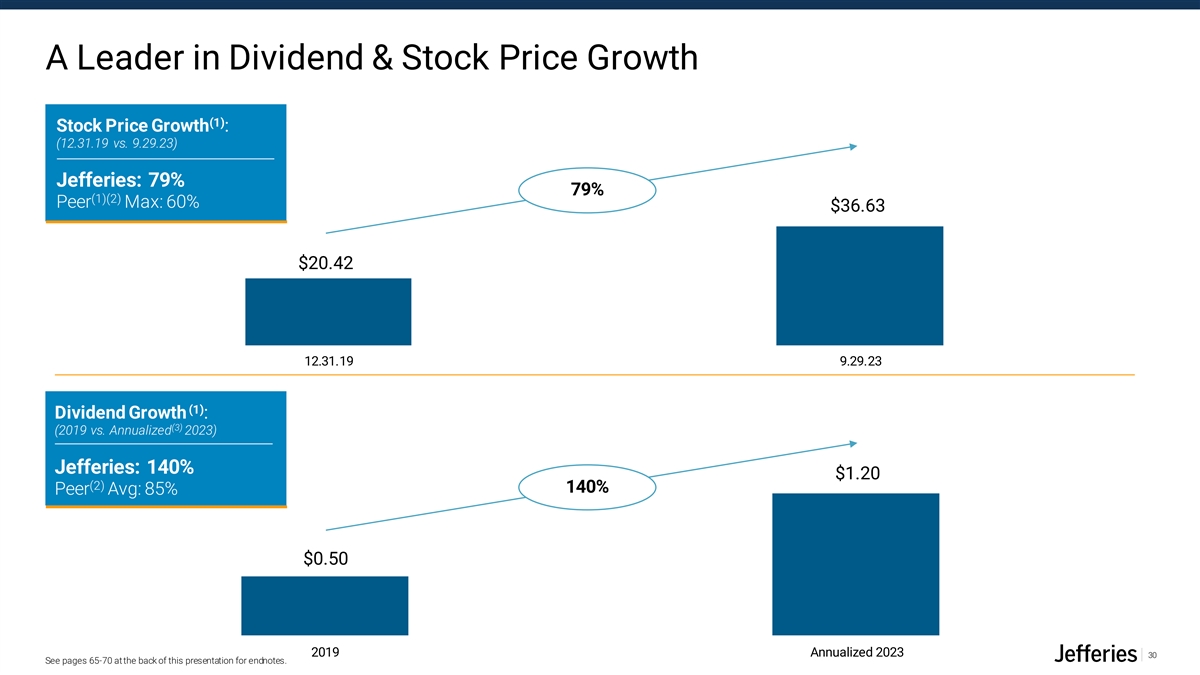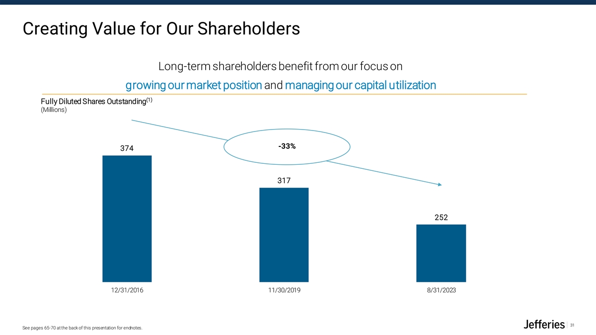 A Leader in Dividend & Stock Price Growth (1) Stock Price Growth : (12.31.19 vs. 9.29.23) Jefferies: 79% 79% (1)(2) Peer Max: 60% $36.63 $20.42 12.31.19 9.29.23 (1) Dividend Growth : (3) (2019 vs. Annualized 2023) Jefferies: 140% $1.20 (2) 140% Peer Avg: 85% $0.50 2019 Annualized 2023 30 See pages 65-70 at the back of this presentation for endnotes.