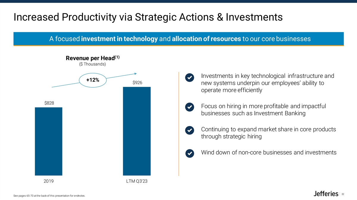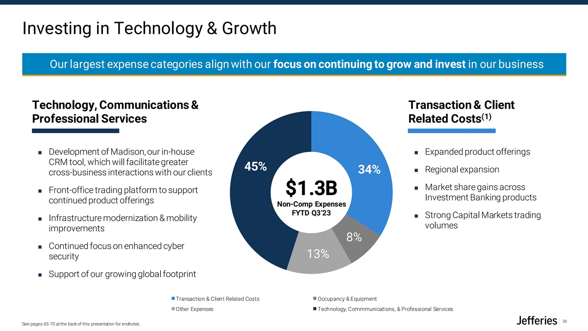 Increased Productivity via Strategic Actions & Investments A focused investment in technology and allocation of resources to our core businesses (1) Revenue per Head ($ Thousands) Investments in key technological infrastructure and +12% $926 new systems underpin our employees’ ability to operate more efficiently $828 Focus on hiring in more profitable and impactful businesses such as Investment Banking Continuing to expand market share in core products through strategic hiring Wind down of non-core businesses and investments 2019 LTM Q3'23 32 See pages 65-70 at the back of this presentation for endnotes.