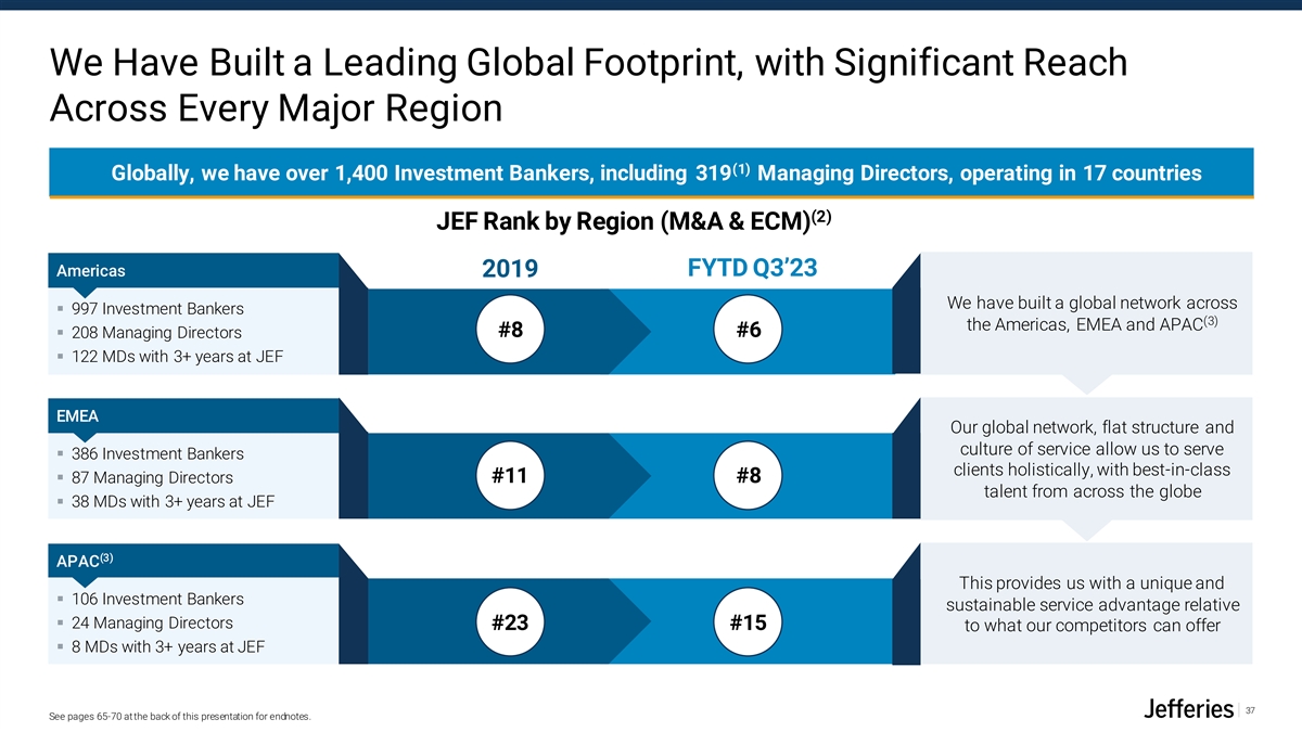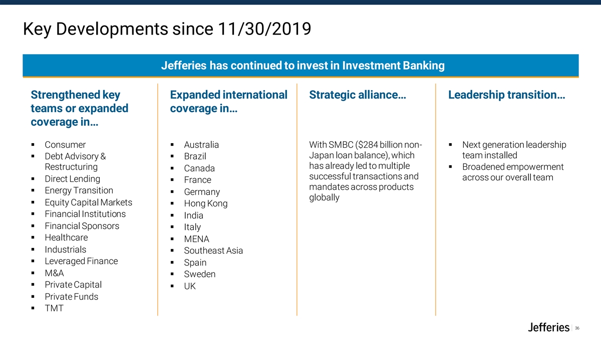 Key Developments since 11/30/2019 Jefferies has continued to invest in Investment Banking Strengthened key Expanded international Strategic alliance… Leadership transition… teams or expanded coverage in… coverage in… ▪ Consumer ▪ Australia With SMBC ($284 billion non-▪ Next generation leadership Japan loan balance), which team installed ▪ Debt Advisory & ▪ Brazil has already led to multiple Restructuring▪ Broadened empowerment ▪ Canada successful transactions and across our overall team ▪ Direct Lending ▪ France mandates across products ▪ Energy Transition ▪ Germany globally ▪ Equity Capital Markets ▪ Hong Kong ▪ Financial Institutions ▪ India ▪ Financial Sponsors ▪ Italy ▪ Healthcare ▪ MENA ▪ Industrials ▪ Southeast Asia ▪ Leveraged Finance ▪ Spain ▪ M&A ▪ Sweden ▪ Private Capital ▪ UK ▪ Private Funds ▪ TMT 36