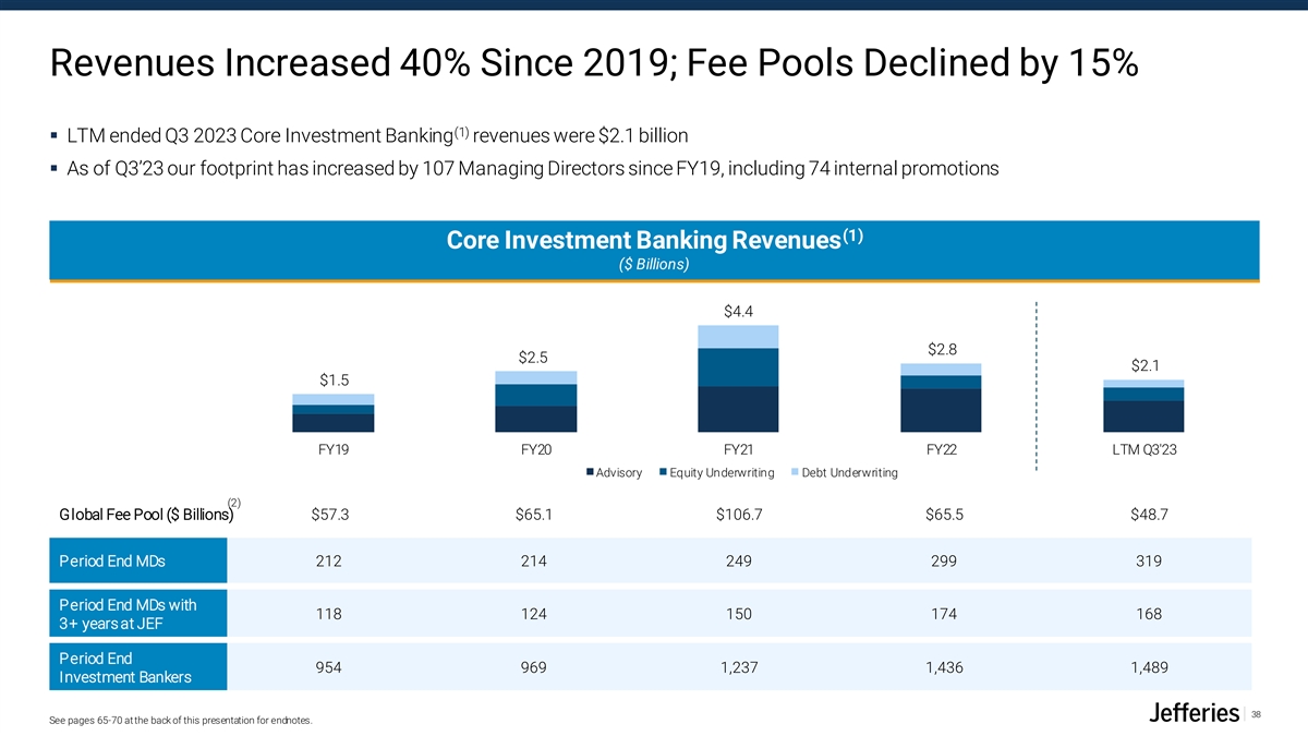 Revenues Increased 40% Since 2019; Fee Pools Declined by 15% (1) ▪ LTM ended Q3 2023 Core Investment Banking revenues were $2.1 billion ▪ As of Q3’23 our footprint has increased by 107 Managing Directors since FY19, including 74 internal promotions (1) Core Investment Banking Revenues ($ Billions) $4.4 $2.8 $2.5 $2.1 $1.5 FY19 FY20 FY21 FY22 LTM Q3'23 Advisory Equity Underwriting Debt Underwriting (2) Global Fee Pool ($ Billions) $57.3 $65.1 $106.7 $65.5 $48.7 Period End MDs 212 214 249 299 319 Period End MDs with 118 124 150 174 168 3+ years at JEF Period End 954 969 1,237 1,436 1,489 Investment Bankers 38 See pages 65-70 at the back of this presentation for endnotes.