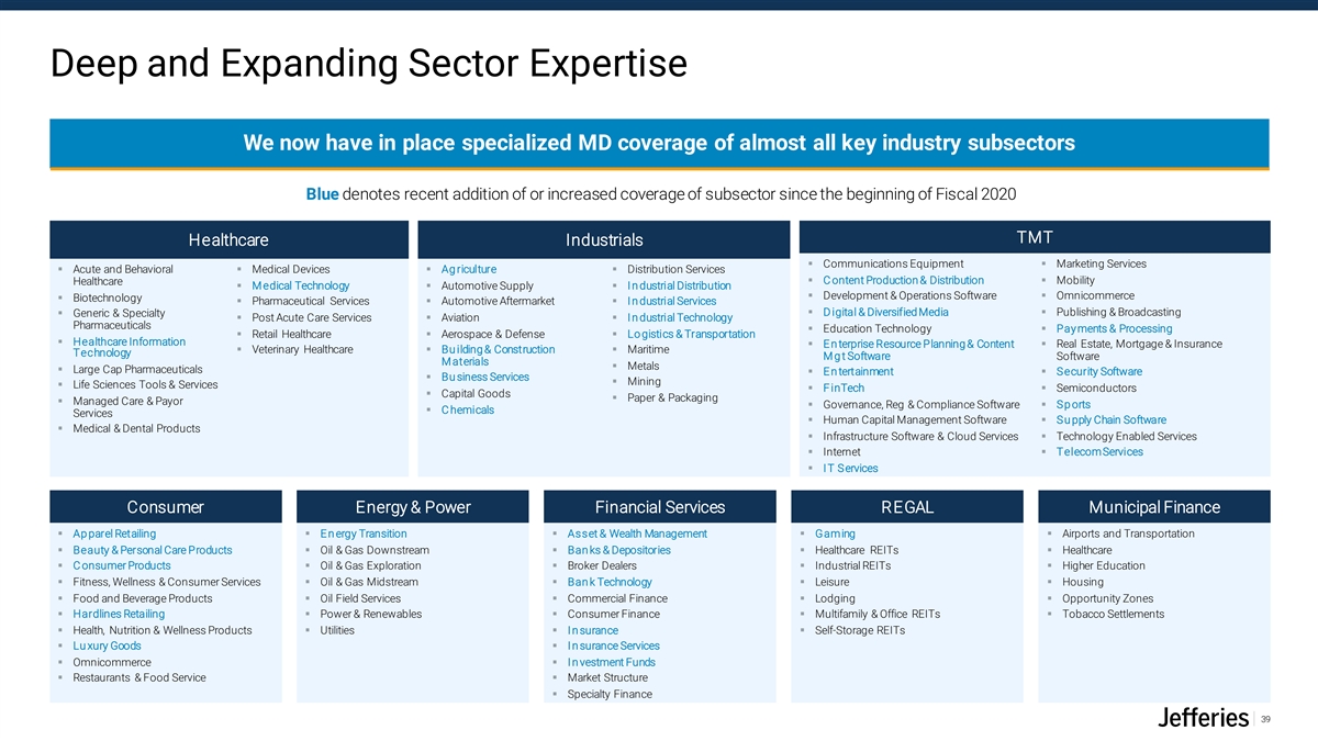 Deep and Expanding Sector Expertise We now have in place specialized MD coverage of almost all key industry subsectors Blue denotes recent addition of or increased coverage of subsector since the beginning of Fiscal 2020 TMT Healthcare Industrials ▪ Communications Equipment▪ Marketing Services ▪ Acute and Behavioral ▪ Medical Devices▪ Ag riculture▪ Distribution Services ▪ C ontent Production & Distribution▪ Mobility Healthcare ▪ M edical Technology▪ Automotive Supply▪ I n dustrial Distribution ▪ Development & Operations Software▪ Omnicommerce ▪ Biotechnology ▪ Pharmaceutical Services▪ Automotive Aftermarket▪ I n dustrial Services ▪ D igital & Diversified Media▪ Publishing & Broadcasting ▪ Generic & Specialty ▪ Post Acute Care Services▪ Aviation▪ I n dustrial Technology Pharmaceuticals ▪ Education Technology▪ Pay ments & Processing ▪ Retail Healthcare▪ Aerospace & Defense▪ Lo gistics & Transportation ▪ Healthcare Information ▪ E n terprise Resource Planning & Content ▪ Real Estate, Mortgage & Insurance ▪ Veterinary Healthcare▪ Bu ilding & Construction ▪ Maritime Technology M g t Software Software M aterials ▪ Metals ▪ Large Cap Pharmaceuticals ▪ E n tertainment▪ Security Software ▪ Bu siness Services ▪ Mining ▪ Life Sciences Tools & Services ▪ F inTech▪ Semiconductors ▪ Capital Goods ▪ Paper & Packaging ▪ Managed Care & Payor ▪ Governance, Reg & Compliance Software▪ Sp orts ▪ C hemicals Services ▪ Human Capital Management Software▪ Su pply Chain Software ▪ Medical & Dental Products ▪ Infrastructure Software & Cloud Services▪ Technology Enabled Services ▪ Internet▪ Telecom Services ▪ I T Services Consumer Energy & Power Financial Services REGAL Municipal Finance ▪ Ap parel Retailing▪ E n ergy Transition▪ Asset & Wealth Management▪ Gaming▪ Airports and Transportation ▪ Beauty & Personal Care Products▪ Oil & Gas Downstream ▪ Ban ks & Depositories▪ Healthcare REITs▪ Healthcare ▪ C onsumer Products▪ Oil & Gas Exploration▪ Broker Dealers ▪ Industrial REITs▪ Higher Education ▪ Fitness, Wellness & Consumer Services▪ Oil & Gas Midstream▪ Ban k Technology▪ Leisure▪ Housing ▪ Food and Beverage Products▪ Oil Field Services▪ Commercial Finance▪ Lodging▪ Opportunity Zones ▪ Hardlines Retailing▪ Power & Renewables▪ Consumer Finance▪ Multifamily & Office REITs▪ Tobacco Settlements ▪ Health, Nutrition & Wellness Products▪ Utilities ▪ I n surance▪ Self-Storage REITs ▪ Lu xury Goods▪ I n surance Services ▪ Omnicommerce▪ I n vestment Funds ▪ Restaurants & Food Service▪ Market Structure ▪ Specialty Finance 39