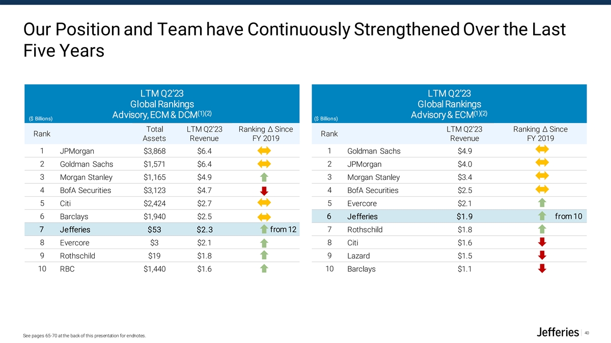 Our Position and Team have Continuously Strengthened Over the Last Five Years LTM Q2’23 LTM Q2’23 Global Rankings Global Rankings (1)(2) (1)(2) Advisory, ECM & DCM Advisory & ECM ($ Billions) ($ Billions) Total LTM Q2’23 Ranking Δ Since LTM Q2’23 Ranking Δ Since Rank Rank Assets Revenue FY 2019 Revenue FY 2019 1 JPMorgan $3,868 $6.4 1 Goldman Sachs $4.9 2 2 Goldman Sachs $1,571 $6.4 JPMorgan $4.0 3 Morgan Stanley $1,165 $4.9 3 Morgan Stanley $3.4 4 BofA Securities $3,123 $4.7 4 BofA Securities $2.5 5 5 Citi $2,424 $2.7 Evercore $2.1 6 Barclays $1,940 $2.5 6 Jefferies $1.9 from 10 7 from 12 7 Jefferies $53 $2.3 Rothschild $1.8 8 Evercore $3 $2.1 8 Citi $1.6 9 Rothschild $19 $1.8 9 Lazard $1.5 10 10 RBC $1,440 $1.6 Barclays $1.1 40 See pages 65-70 at the back of this presentation for endnotes.