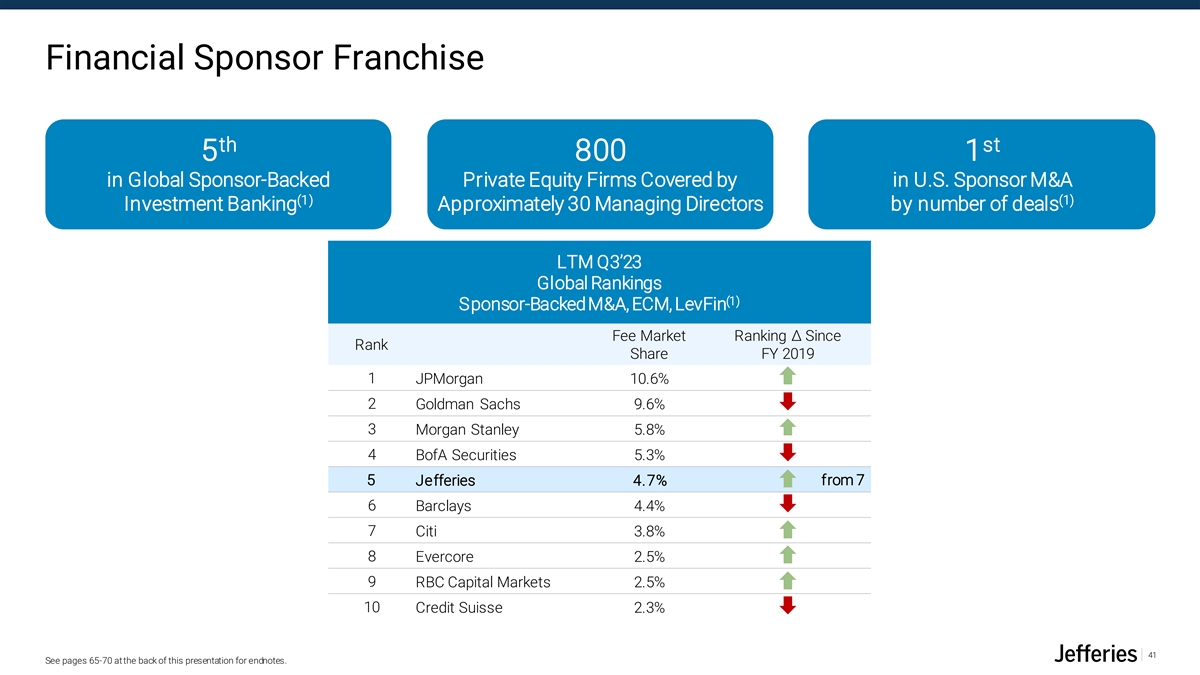Financial Sponsor Franchise th st 5 800 1 in Global Sponsor-Backed Private Equity Firms Covered by in U.S. Sponsor M&A (1) (1) Investment Banking Approximately 30 Managing Directors by number of deals LTM Q3’23 Global Rankings (1) Sponsor-Backed M&A, ECM, LevFin Fee Market Ranking Δ Since Rank Share FY 2019 1 JPMorgan 10.6% 2 Goldman Sachs 9.6% 3 Morgan Stanley 5.8% 4 BofA Securities 5.3% 5 from 7 Jefferies 4.7% 6 Barclays 4.4% 7 Citi 3.8% 8 Evercore 2.5% 9 RBC Capital Markets 2.5% 10 Credit Suisse 2.3% 41 See pages 65-70 at the back of this presentation for endnotes.