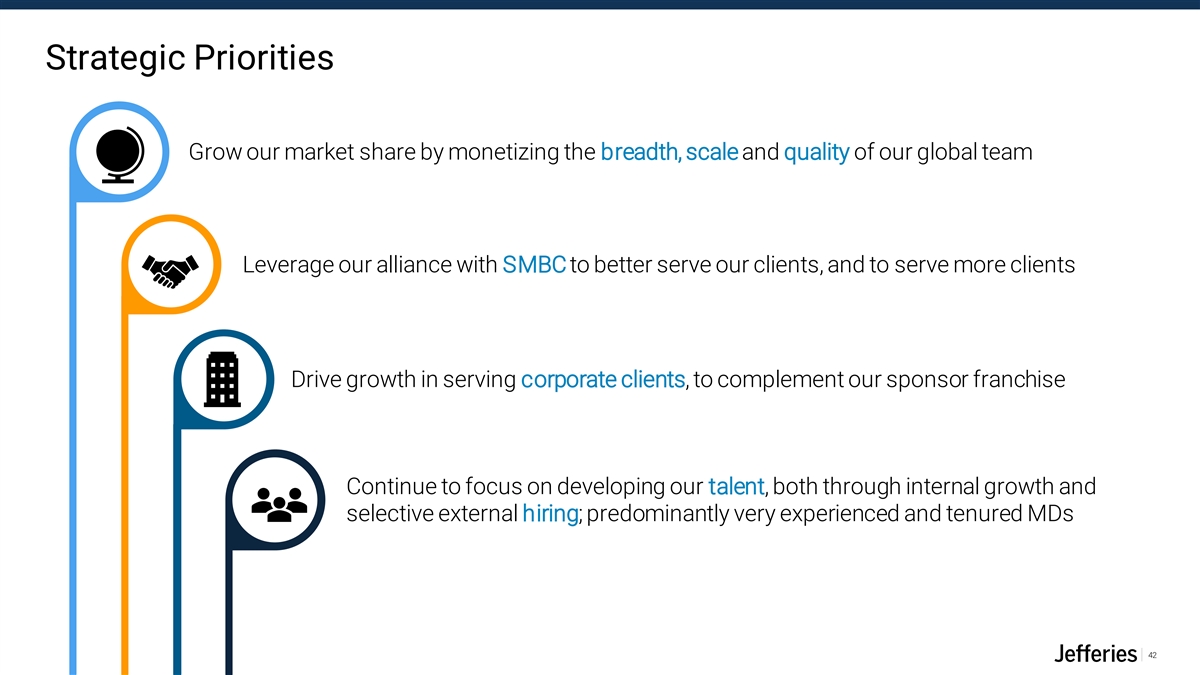 Strategic Priorities Grow our market share by monetizing the breadth, scale and quality of our global team Leverage our alliance with SMBC to better serve our clients, and to serve more clients Drive growth in serving corporate clients, to complement our sponsor franchise Continue to focus on developing our talent, both through internal growth and selective external hiring; predominantly very experienced and tenured MDs 42